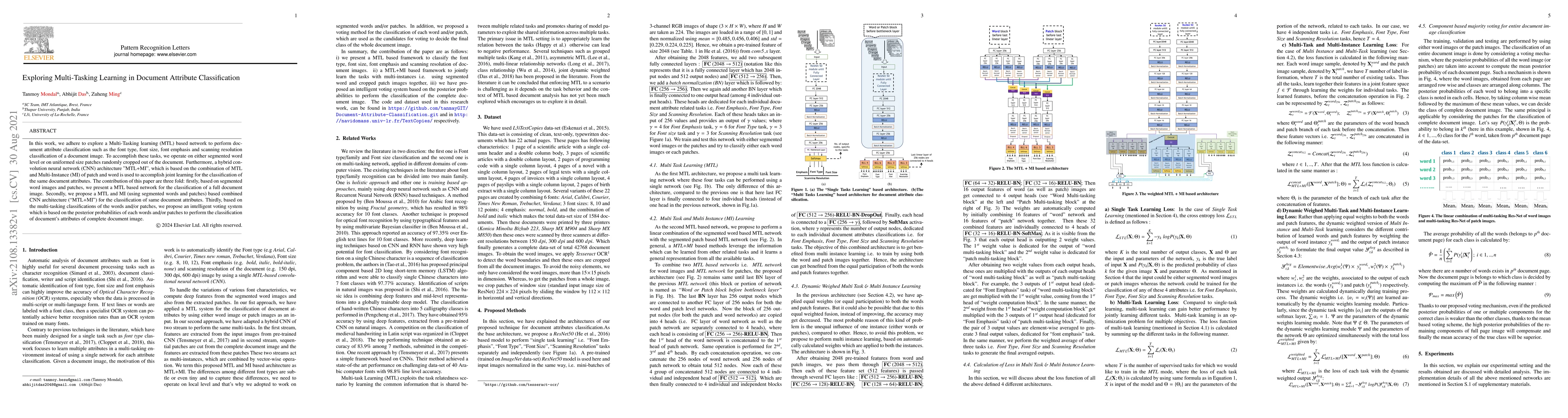 This paper explores a Multi-Tasking learning (MTL) network for classifying document attributes like font type and scanning resolution using either segmented word images or patches. It introduces a hybrid CNN architecture "MTL+MI" combining MTL and Multi-Instance learning for joint attribute classification and proposes an intelligent voting system based on posterior probabilities for final document attribute determination.