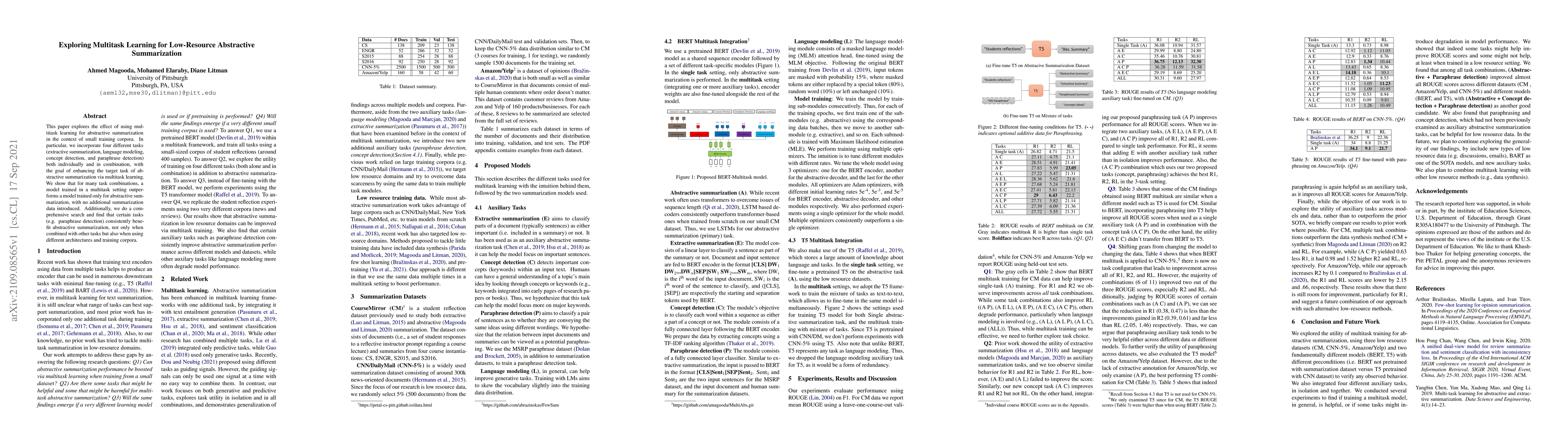 This paper investigates multitask learning for abstractive summarization in low-resource settings, finding that incorporating tasks like extractive summarization and paraphrase detection improves performance over single-task models. Paraphrase detection, in particular, consistently benefits abstractive summarization across various task combinations and architectures.