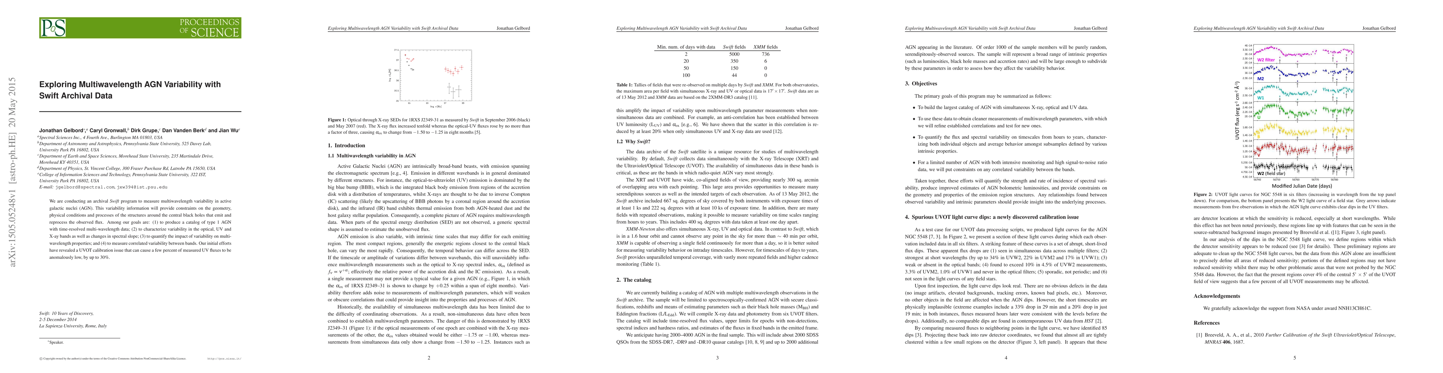We are conducting an archival Swift program to measure multiwavelength variability in active galactic nuclei (AGN). This variability information will provide constraints on the geometry, physical conditions and processes of the structures around the central black holes that emit and reprocess the observed flux. Among our goals are: (1) to produce a catalog of type 1 AGN with time-resolved multi-wavelength data; (2) to characterize variability in the optical, UV and X-ay bands as well as changes in spectral slope; (3) to quantify the impact of variability on multi-wavelength properties; and (4) to measure correlated variability between bands. Our initial efforts have revealed a UVOT calibration issue that can cause a few percent of measured UV fluxes to be anomalously low, by up to 30%.
