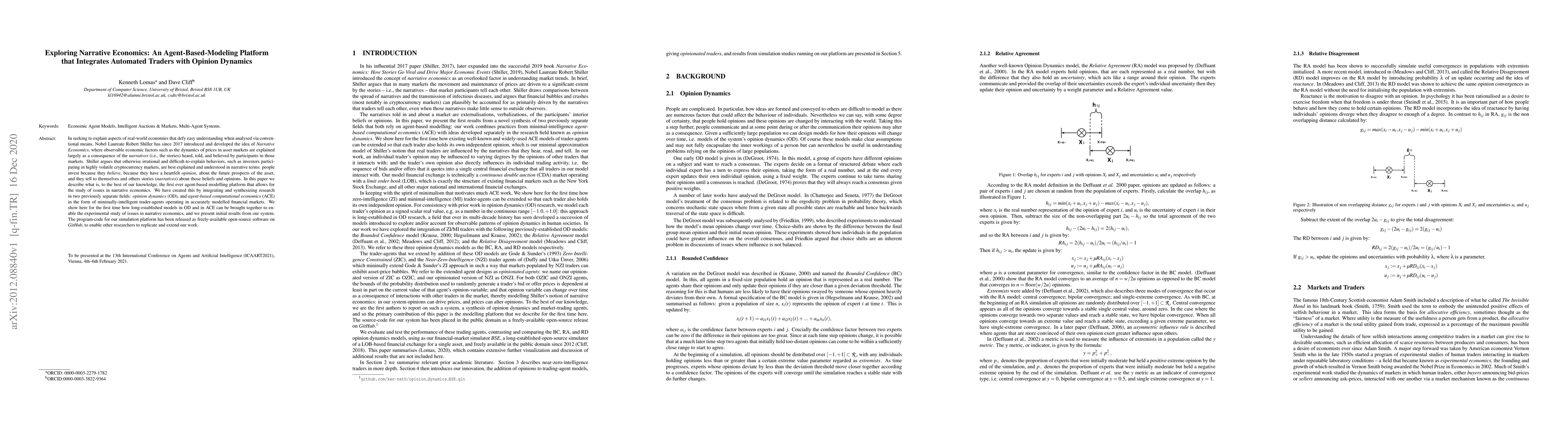 In seeking to explain aspects of real-world economies that defy easy understanding when analysed via conventional means, Nobel Laureate Robert Shiller has since 2017 introduced and developed the idea of Narrative Economics, where observable economic factors such as the dynamics of prices in asset markets are explained largely as a consequence of the narratives (i.e., the stories) heard, told, and believed by participants in those markets. Shiller argues that otherwise irrational and difficult-to-explain behaviors, such as investors participating in highly volatile cryptocurrency markets, are best explained and understood in narrative terms: people invest because they believe, because they have a heartfelt opinions, about the future prospects of the asset, and they tell to themselves and others stories (narratives) about those beliefs and opinions. In this paper we describe what is, to the best of our knowledge, the first ever agent-based modelling platform that allows for the study of issues in narrative economics. We have created this by integrating and synthesizing research in two previously separate fields: opinion dynamics (OD), and agent-based computational economics (ACE) in the form of minimally-intelligent trader-agents operating in accurately modelled financial markets. We show here for the first time how long-established models in OD and in ACE can be brought together to enable the experimental study of issues in narrative economics, and we present initial results from our system. The program-code for our simulation platform has been released as freely-available open-source software on GitHub, to enable other researchers to replicate and extend our work