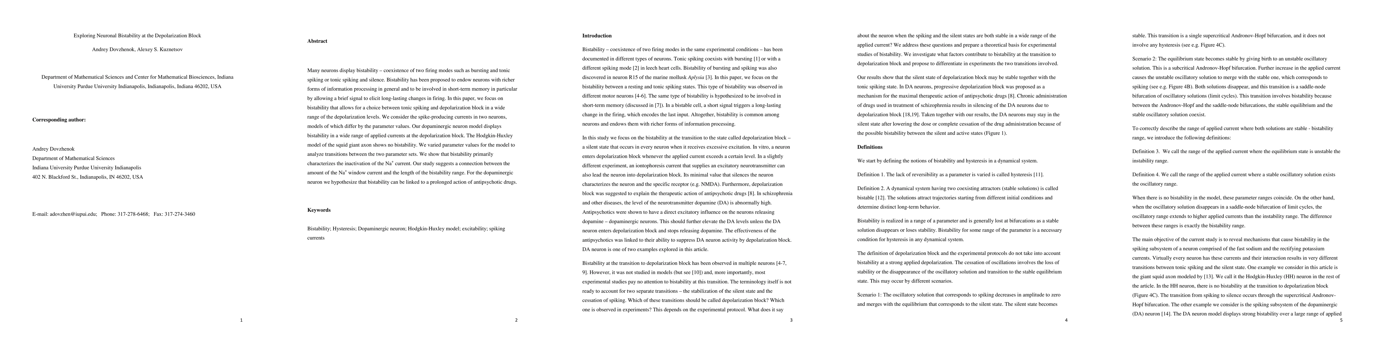 This paper investigates neuronal bistability, particularly the transition between tonic spiking and depolarization block, using two neuron models. The dopaminergic neuron model exhibits bistability over a wide range of depolarization levels, while the Hodgkin-Huxley model does not, suggesting that Na+ current inactivation is key to bistability, with the Na+ window current influencing the bistability range.