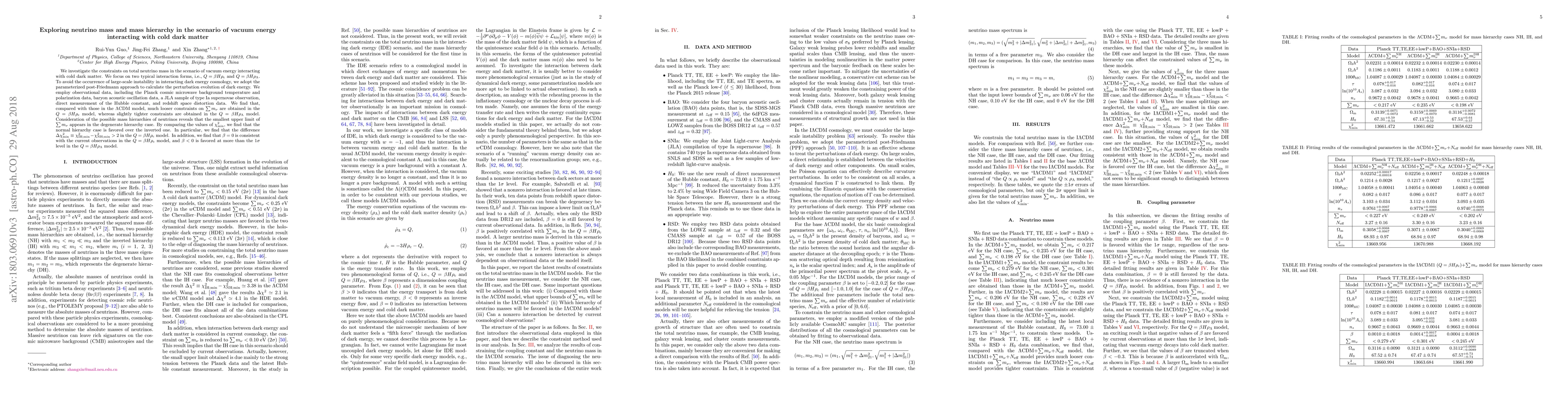 This paper explores constraints on total neutrino mass in models where vacuum energy interacts with cold dark matter, finding looser constraints in the $Q=\beta H\rho_{\rm c}$ model and slightly tighter constraints in the $Q=\beta H\rho_{\Lambda}$ model. The normal hierarchy of neutrinos is favored over the inverted one.