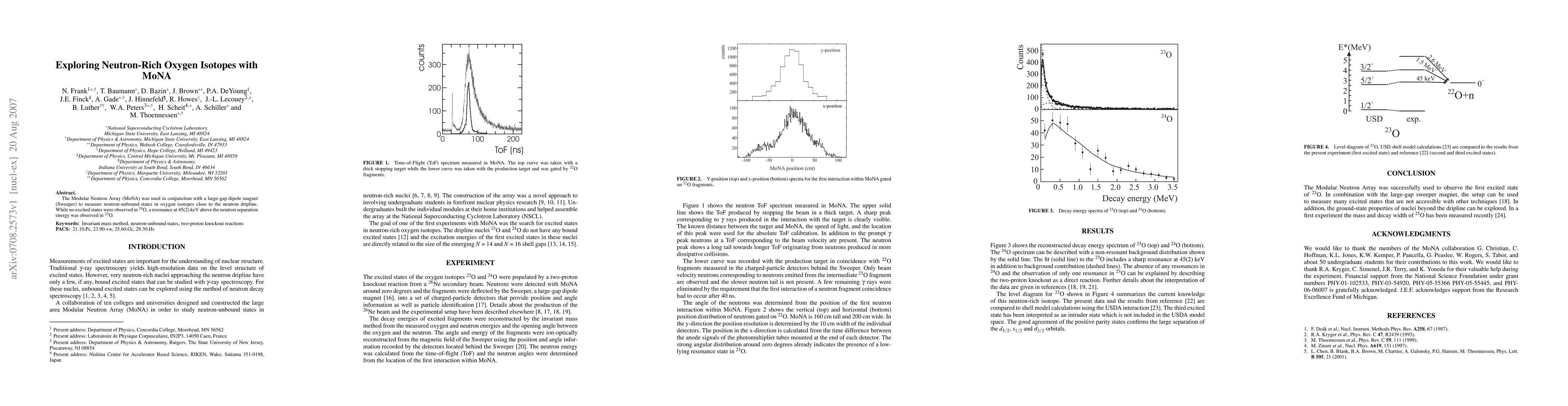 Researchers used MoNA to detect a resonance in 23O at 45(2) keV above the neutron separation energy, revealing a new excited state near the neutron dripline. No excited states were observed in 24O.