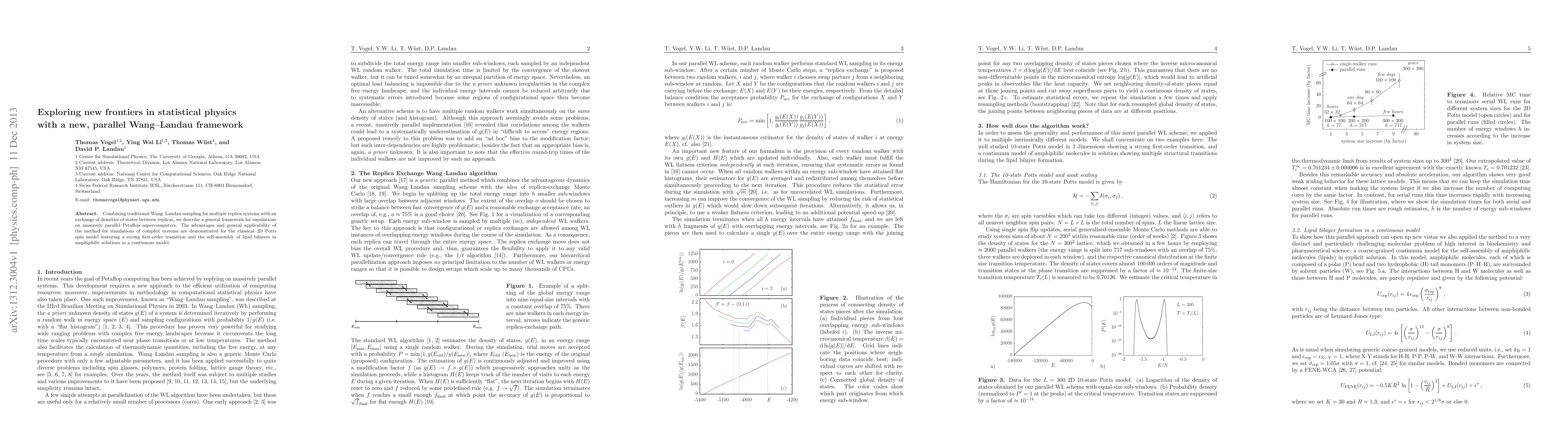 This paper introduces a novel parallel Wang-Landau framework for statistical physics simulations on Petaflop supercomputers, combining replica exchange with density-of-states sharing. The method's effectiveness is demonstrated through simulations of the 2D Potts model and lipid bilayer self-assembly.