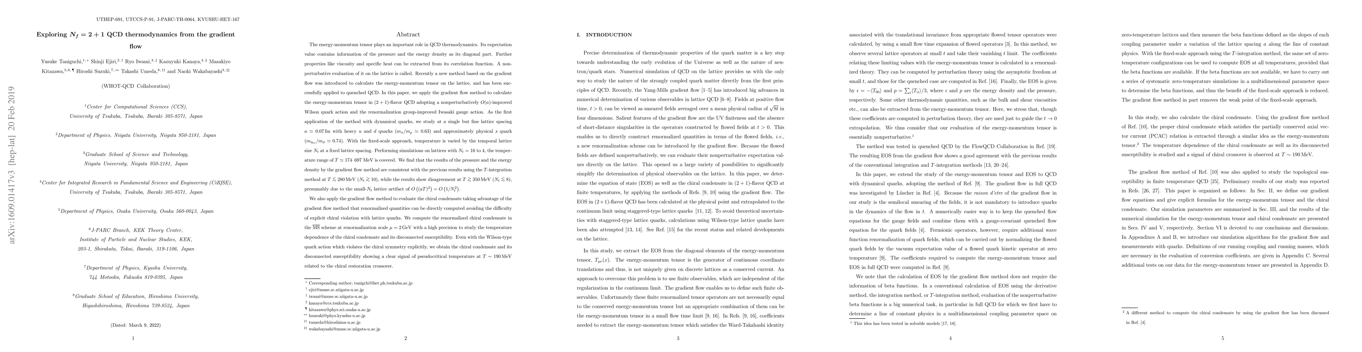 This paper applies the gradient flow method to calculate the energy-momentum tensor in (2+1)-flavor QCD, finding consistent results with previous methods at lower temperatures but disagreement at higher temperatures likely due to lattice artifacts. It also evaluates the chiral condensate with high precision, revealing a pseudocritical temperature at T~190 MeV related to chiral restoration.