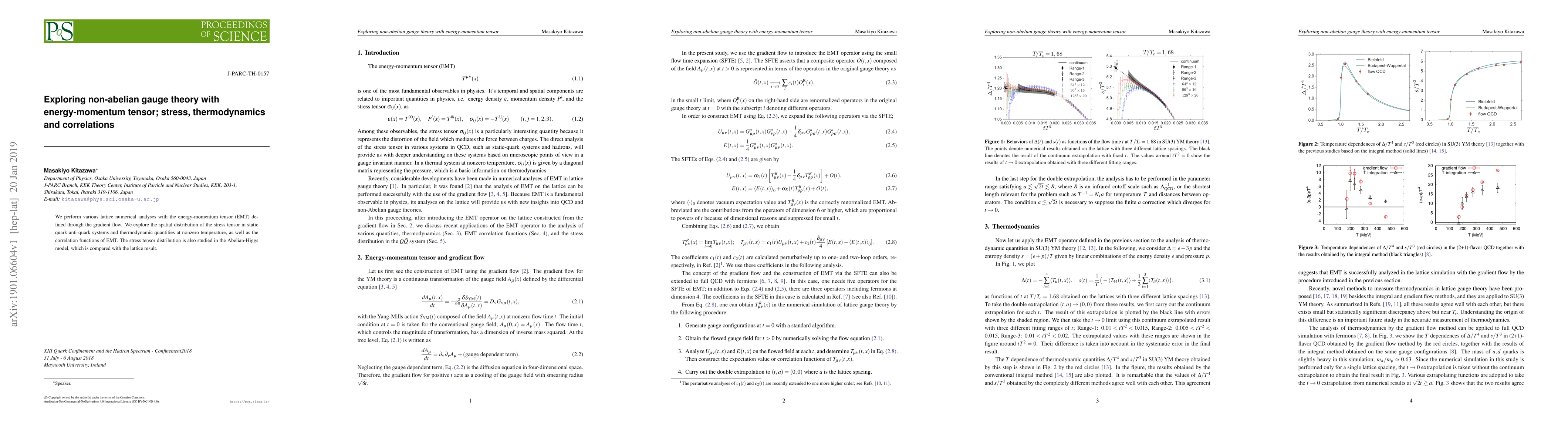 This research utilizes lattice numerical analyses with the energy-momentum tensor (EMT) from gradient flow to examine stress distribution in quark systems, thermodynamic properties at high temperatures, and EMT correlation functions. It also compares these findings with an Abelian-Higgs model, contributing to our understanding of non-Abelian gauge theory.