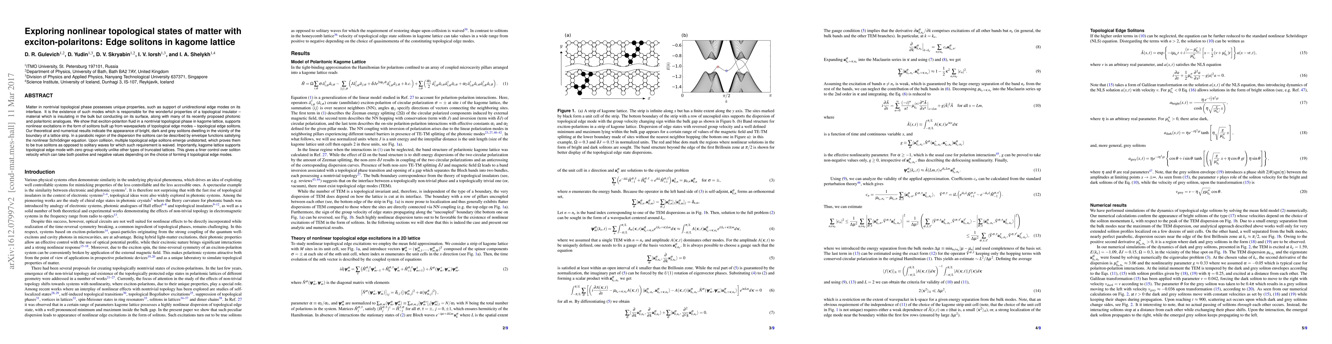 This paper investigates nonlinear topological states in exciton-polariton fluids within a kagome lattice, demonstrating the existence of topological edge solitons. These solitons, including bright, dark, and grey types, emerge from topological edge modes and maintain their integrity upon collision, showcasing their true soliton nature.