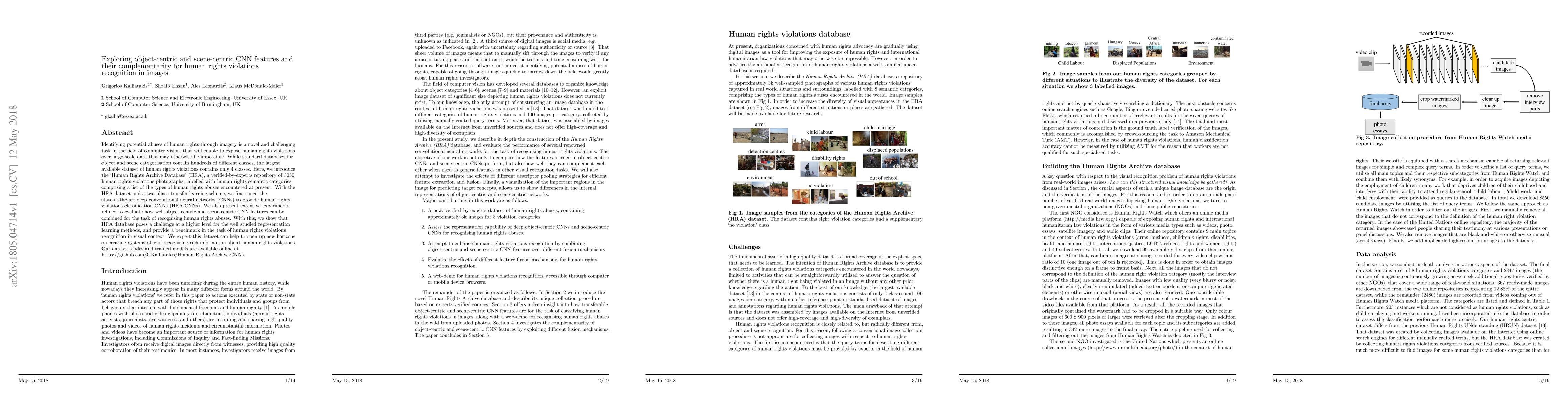 This paper introduces the `Human Rights Archive Database' (HRA) to recognize human rights violations through imagery, employing fine-tuned CNNs for classification. It explores the complementarity of object-centric and scene-centric CNN features for this task, demonstrating that combining these features enhances recognition performance.