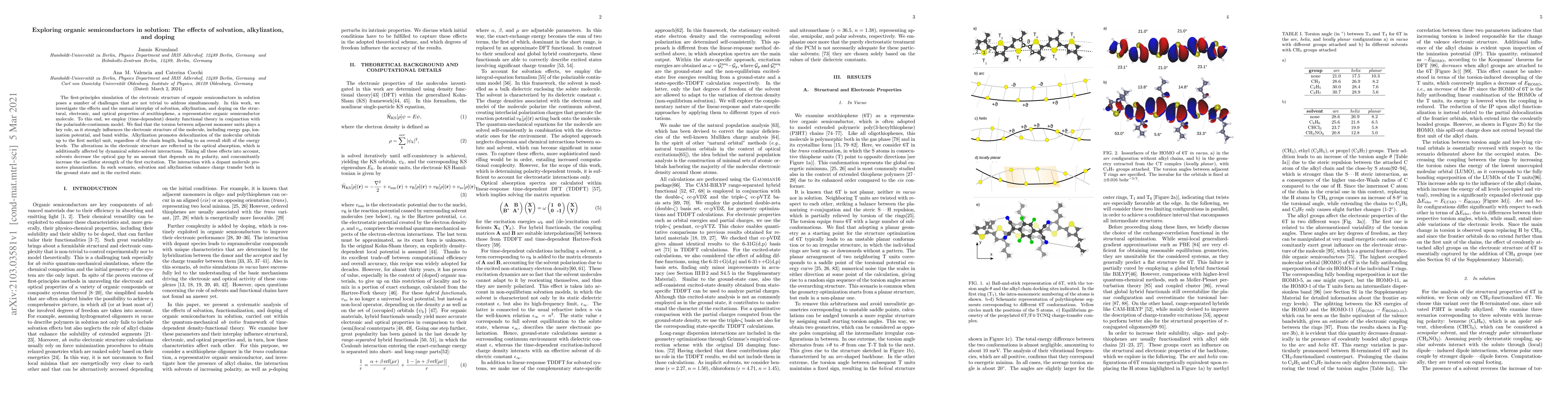 Researchers studied how solvation, alkylization, and doping affect organic semiconductors, finding that these processes alter energy gaps, optical absorption, and charge transfer.