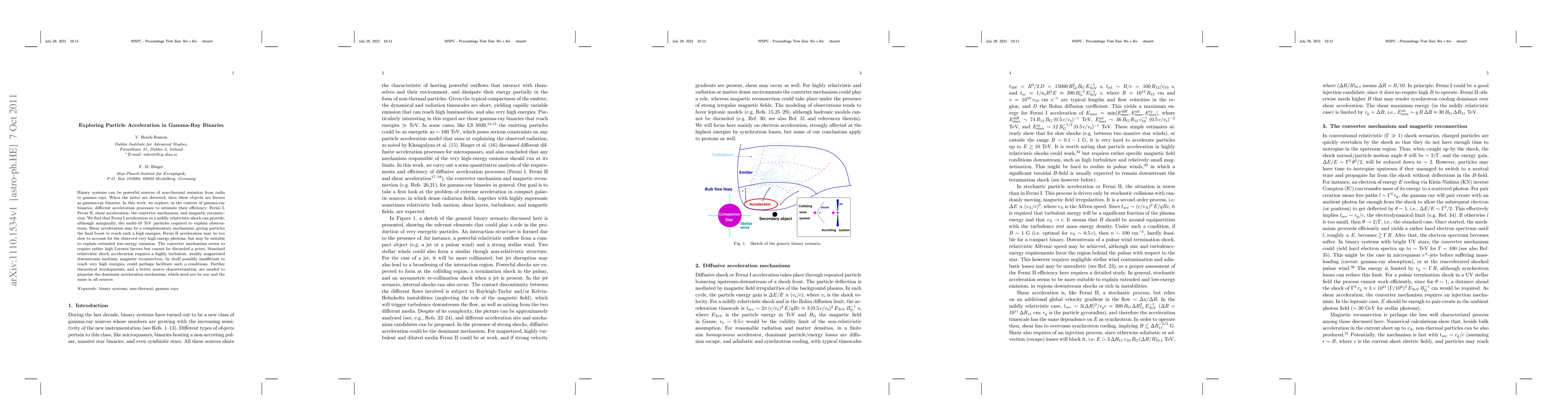 This paper investigates various particle acceleration processes in gamma-ray binaries, finding that Fermi I acceleration in mildly relativistic shocks can marginally produce the high-energy particles observed, while shear acceleration may provide the final energy boost. Further research is needed to determine the dominant acceleration mechanism.