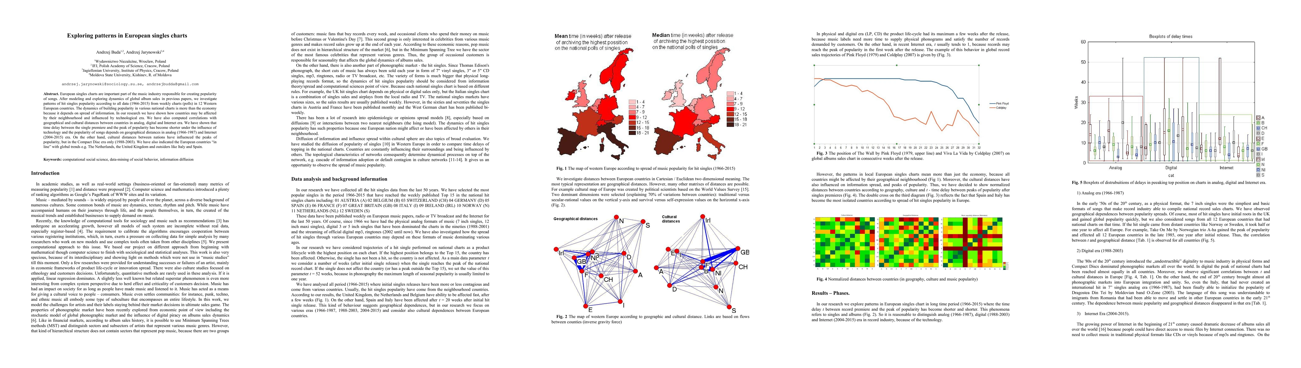 European singles charts are important part of the music industry responsible for creating popularity of songs. After modeling and exploring dynamics of global album sales in previous papers, we investigate patterns of hit singles popularity according to all data (1966-2015) from weekly charts (polls) in 12 Western European countries. The dynamics of building popularity in various national charts is more than the economy because it depends on spread of information. In our research we have shown how countries may be affected by their neighbourhood and influenced by technological era. We have also computed correlations with geographical and cultural distances between countries in analog, digital and Internet era. We have shown that time delay between the single premiere and the peak of popularity has become shorter under the influence of technology and the popularity of songs depends on geographical distances in analog (1966-1987) and Internet (2004-2015) era. On the other hand, cultural distances between nations have influenced the peaks of popularity, but in the Compact Disc era only (1988-2003). We have also indicated the European countries in line with global trends e.g. The Netherlands, the United Kingdom and outsiders like Italy and Spain.