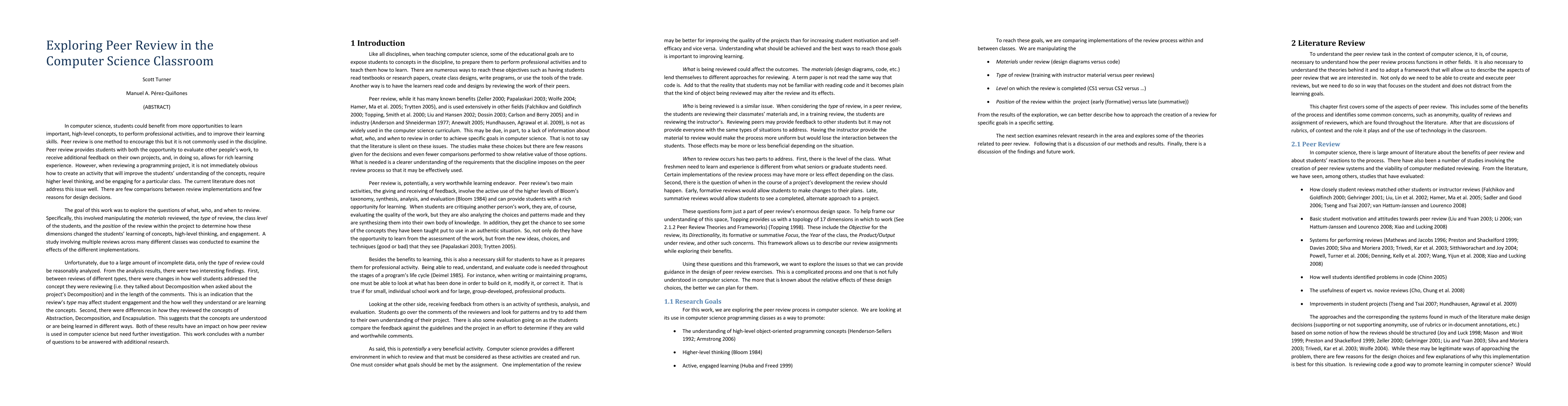 This study investigates how different types of peer review in computer science classrooms impact students' conceptual understanding, high-level thinking, and engagement. Results indicate that the type of review influences students' conceptual grasp and feedback length, suggesting varied effects on engagement and learning.