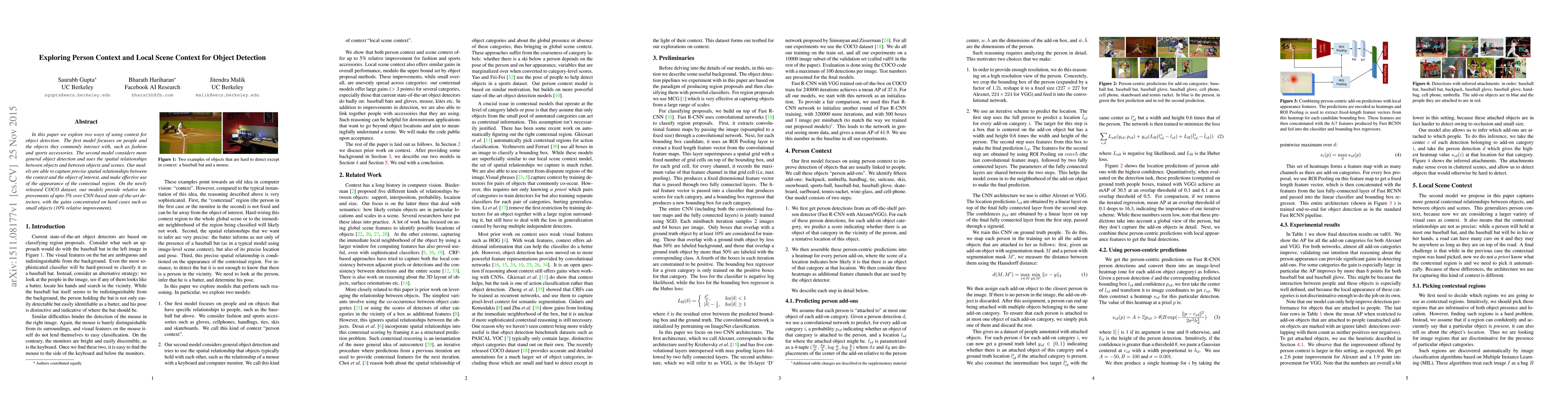 This paper investigates the use of person context and local scene context to enhance object detection, achieving up to a 5% improvement over CNN-based detectors on the COCO dataset, especially for small objects with a 10% relative improvement.