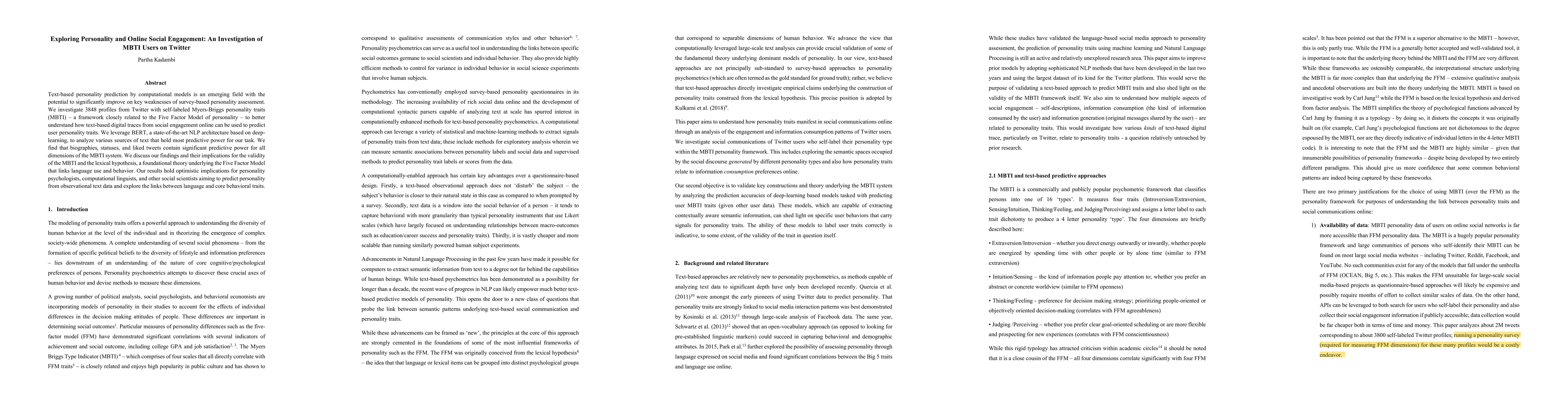 Text-based personality prediction by computational models is an emerging field with the potential to significantly improve on key weaknesses of survey-based personality assessment. We investigate 3848 profiles from Twitter with self-labeled Myers-Briggs personality traits (MBTI) - a framework closely related to the Five Factor Model of personality - to better understand how text-based digital traces from social engagement online can be used to predict user personality traits. We leverage BERT, a state-of-the-art NLP architecture based on deep learning, to analyze various sources of text that hold most predictive power for our task. We find that biographies, statuses, and liked tweets contain significant predictive power for all dimensions of the MBTI system. We discuss our findings and their implications for the validity of the MBTI and the lexical hypothesis, a foundational theory underlying the Five Factor Model that links language use and behavior. Our results hold optimistic implications for personality psychologists, computational linguists, and other social scientists aiming to predict personality from observational text data and explore the links between language and core behavioral traits.