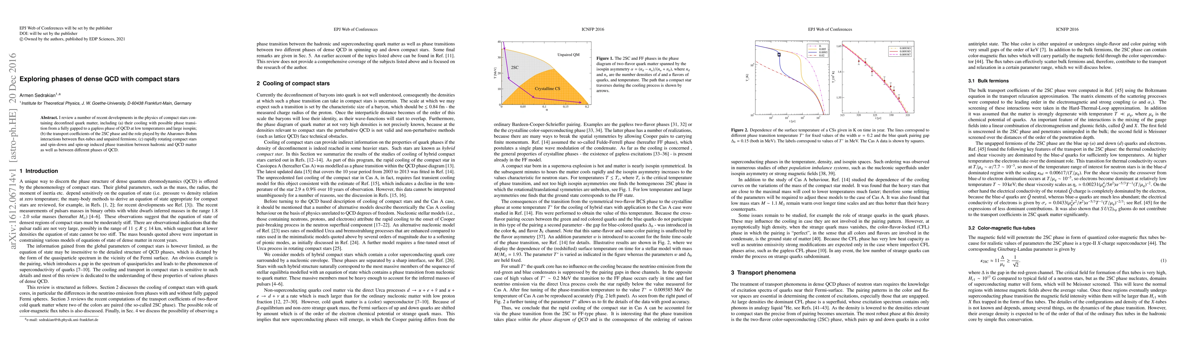 This paper reviews recent advancements in dense QCD physics within compact stars, focusing on cooling processes, phase transitions, and transport coefficients in deconfined quark matter, including the 2SC phase and its interactions, as well as the effects of rapid rotation on phase transitions.