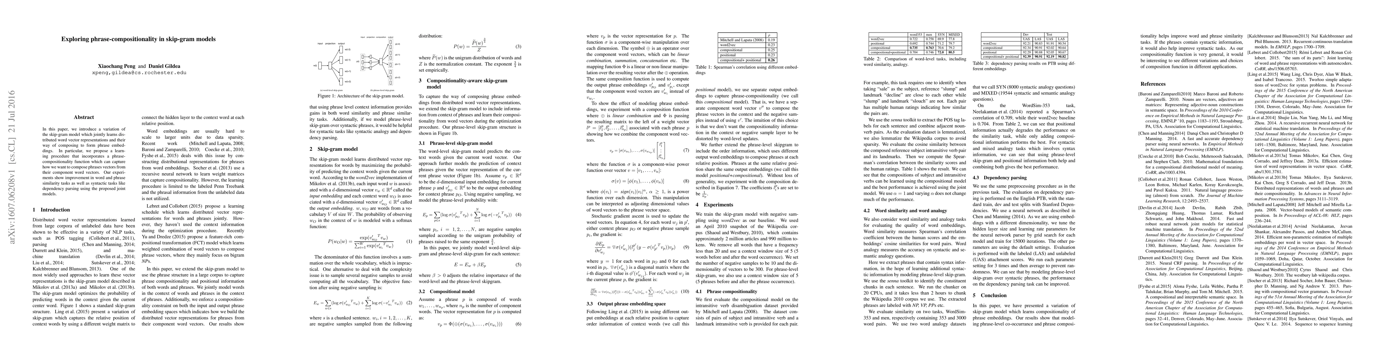 In this paper, we introduce a variation of the skip-gram model which jointly learns distributed word vector representations and their way of composing to form phrase embeddings. In particular, we propose a learning procedure that incorporates a phrase-compositionality function which can capture how we want to compose phrases vectors from their component word vectors. Our experiments show improvement in word and phrase similarity tasks as well as syntactic tasks like dependency parsing using the proposed joint models.