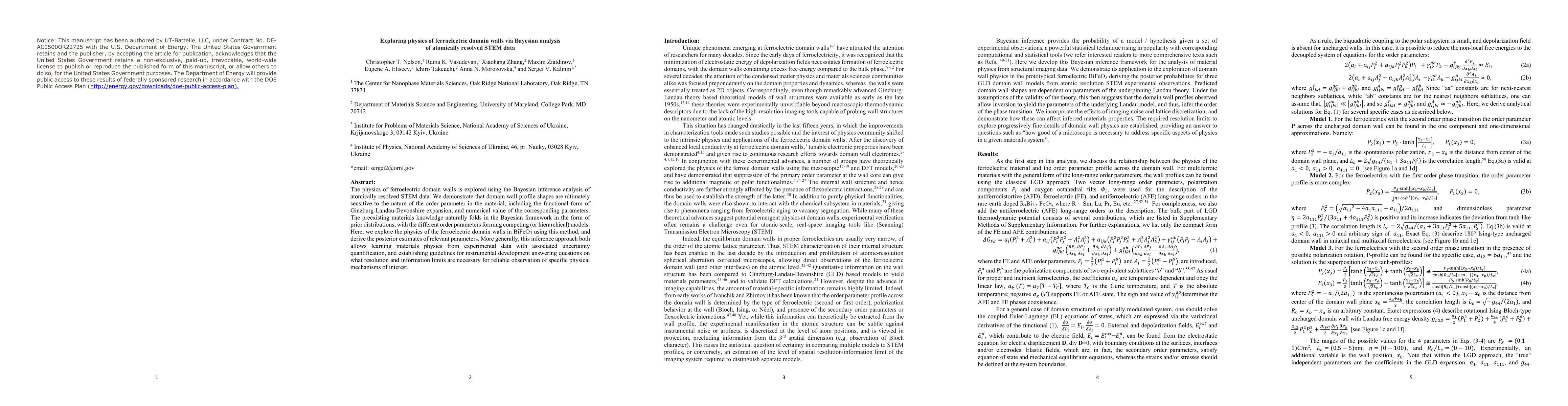 The physics of ferroelectric domain walls is explored using the Bayesian inference analysis of atomically resolved STEM data. We demonstrate that domain wall profile shapes are ultimately sensitive to the nature of the order parameter in the material, including the functional form of Ginzburg-Landau-Devonshire expansion, and numerical value of the corresponding parameters. The preexisting materials knowledge naturally folds in the Bayesian framework in the form of prior distributions, with the different order parameters forming competing (or hierarchical) models. Here, we explore the physics of the ferroelectric domain walls in BiFeO3 using this method, and derive the posterior estimates of relevant parameters. More generally, this inference approach both allows learning materials physics from experimental data with associated uncertainty quantification, and establishing guidelines for instrumental development answering questions on what resolution and information limits are necessary for reliable observation of specific physical mechanisms of interest.