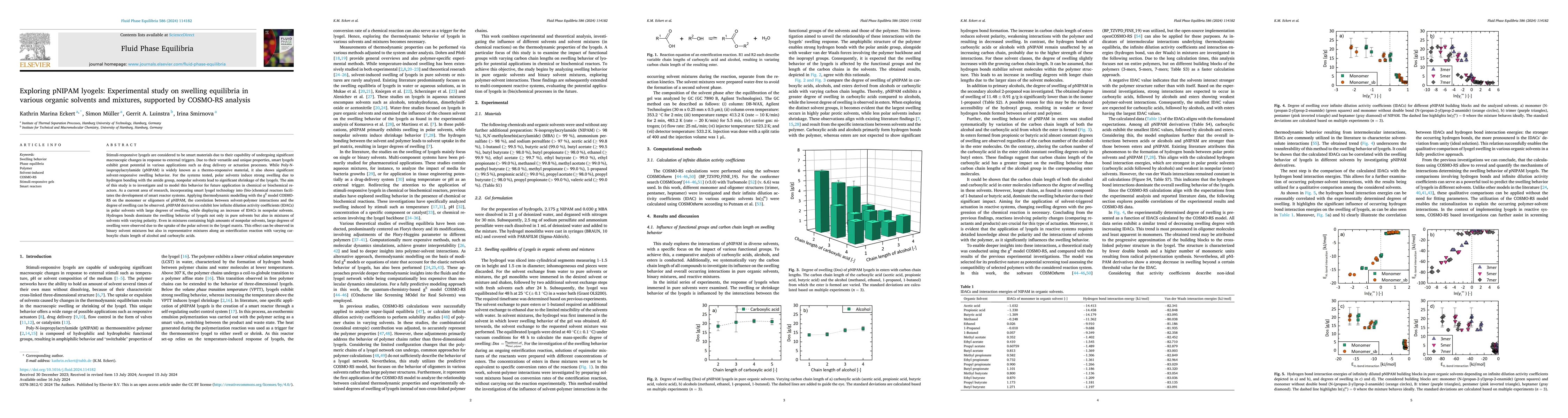 Stimuli-responsive lyogels are considered to be smart materials due to their capability of undergoing significant macroscopic changes in response to external triggers. Due to their versatile and unique properties, smart lyogels exhibit great potential in various applications such as drug delivery or actuation processes. While Poly-N-isopropylacrylamide (pNIPAM) is widely known as a thermo-responsive material, it also shows significant solvent-responsive swelling behavior. As polar solvents induce strong swelling due to hydrogen bonding with the amide group, nonpolar solvents lead to significant shrinkage of the lyogels. The aim of this study is to investigate and to model this behavior for future application in chemical or biochemical reactors. As a current area of research, incorporating smart hydrogel technology into (bio-)chemical reactors facilitates the development of smart reactor systems. Applying thermodynamic modelling with the gE model COSMO-RS on the monomer or oligomers of pNIPAM, the correlation between solvent-polymer interactions and the degree of swelling can be observed. pNIPAM derivatives exhibit low infinitive dilution activity coefficients (IDACs) in polar solvents with large degrees of swelling, while displaying an increase of IDACs in nonpolar solvents. Hydrogen bonds dominate the swelling behavior of lyogels not only in pure solvents but also in mixtures of solvents with varying polarity. Even in mixtures containing high amounts of nonpolar solvents, large degrees of swelling were observed due to the uptake of the polar solvent in the lyogel matrix. This effect can be observed in binary solvent mixtures but also in representative mixtures along an esterification reaction with varying carboxylic chain length of alcohol and carboxylic acids.