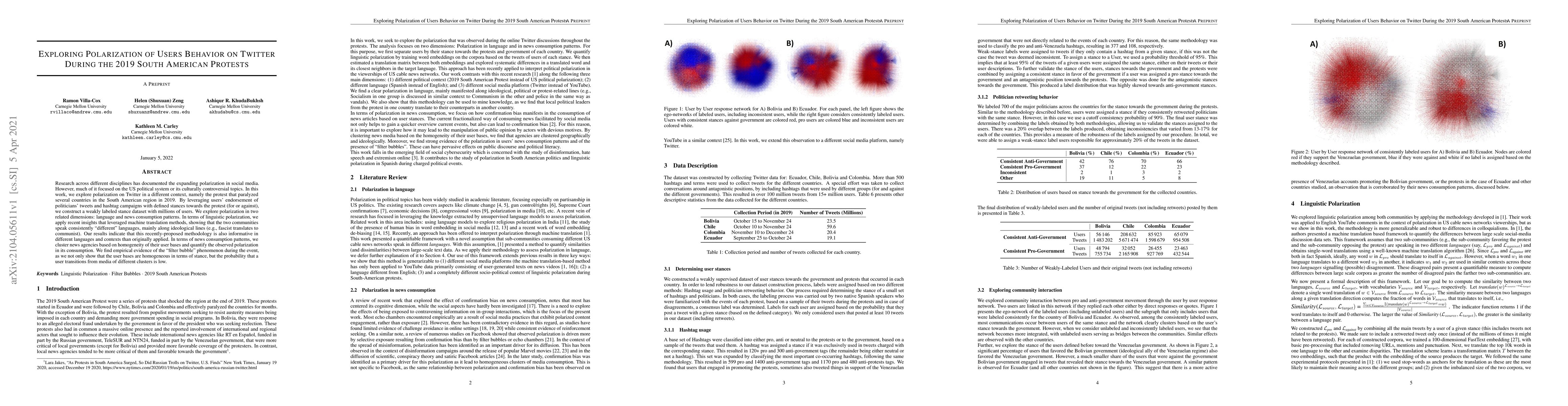 Research across different disciplines has documented the expanding polarization in social media. However, much of it focused on the US political system or its culturally controversial topics. In this work, we explore polarization on Twitter in a different context, namely the protest that paralyzed several countries in the South American region in 2019. By leveraging users' endorsement of politicians' tweets and hashtag campaigns with defined stances towards the protest (for or against), we construct a weakly labeled stance dataset with millions of users. We explore polarization in two related dimensions: language and news consumption patterns. In terms of linguistic polarization, we apply recent insights that leveraged machine translation methods, showing that the two communities speak consistently "different" languages, mainly along ideological lines (e.g., fascist translates to communist). Our results indicate that this recently-proposed methodology is also informative in different languages and contexts than originally applied. In terms of news consumption patterns, we cluster news agencies based on homogeneity of their user bases and quantify the observed polarization in its consumption. We find empirical evidence of the "filter bubble" phenomenon during the event, as we not only show that the user bases are homogeneous in terms of stance, but the probability that a user transitions from media of different clusters is low.