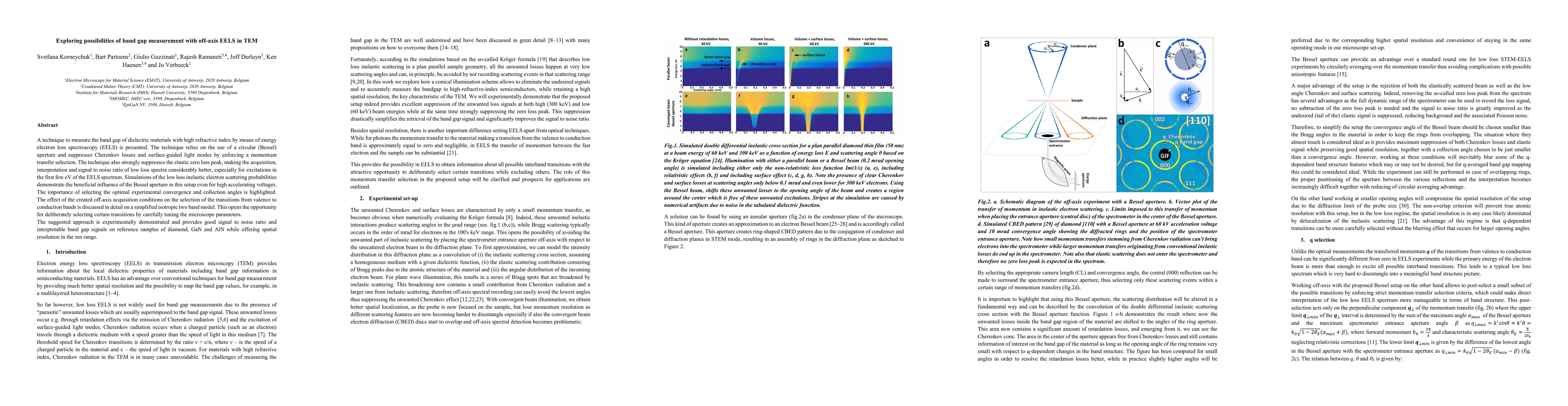 This paper presents a novel technique using off-axis EELS in TEM to measure the band gap of dielectric materials with high refractive indices, employing a Bessel aperture to enhance signal-to-noise ratio and selectivity of transitions from valence to conduction bands. Experimental results on diamond, GaN, and AlN demonstrate the method's effectiveness.