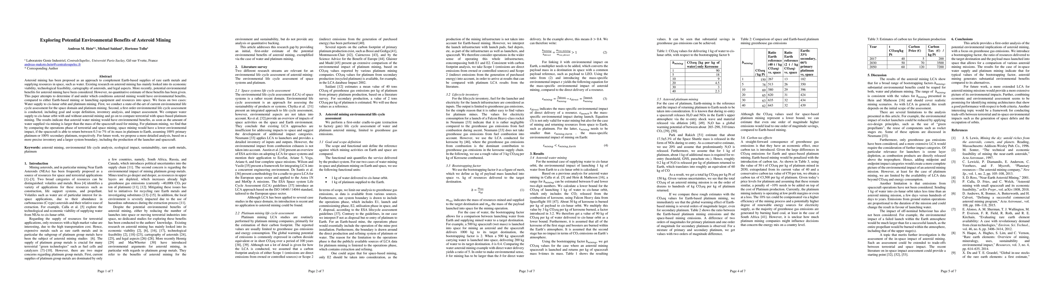 This paper investigates the potential environmental benefits of asteroid mining, comparing it to Earth-based mining and space resource transport. It finds that asteroid water mining could be environmentally beneficial if the mined water exceeds the spacecraft's mass, while space-based platinum mining may have lower impacts if it returns 0.3-7% of its mass in platinum.