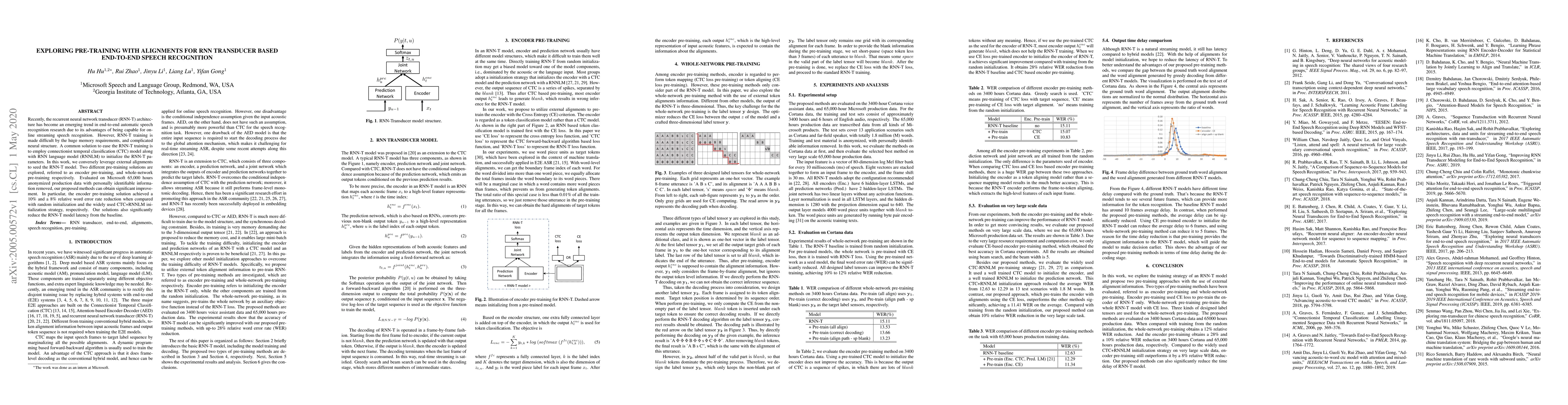 This paper investigates pre-training techniques for RNN-T models in end-to-end speech recognition, proposing encoder and whole-network pre-training using external alignments to ease training complexity. The methods show significant improvements in word error rate and model latency on large-scale production data.