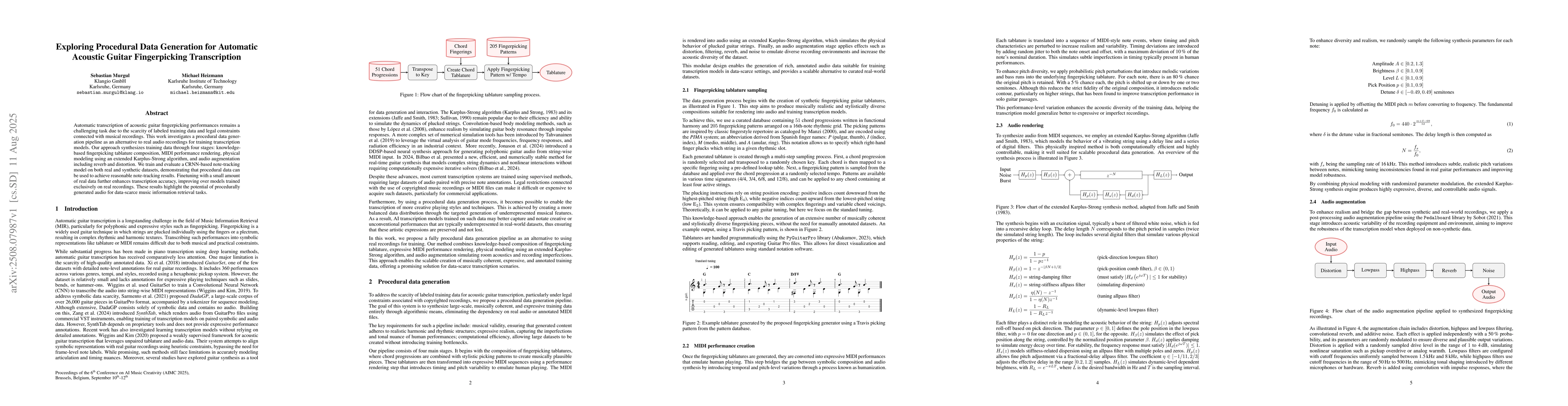 The paper investigates a procedural data generation pipeline for automatic acoustic guitar fingerpicking transcription, involving four stages: knowledge-based fingerpicking tablature composition, MIDI performance rendering, physical modeling using an extended Karplus-Strong algorithm, and audio augmentation including reverb and distortion.