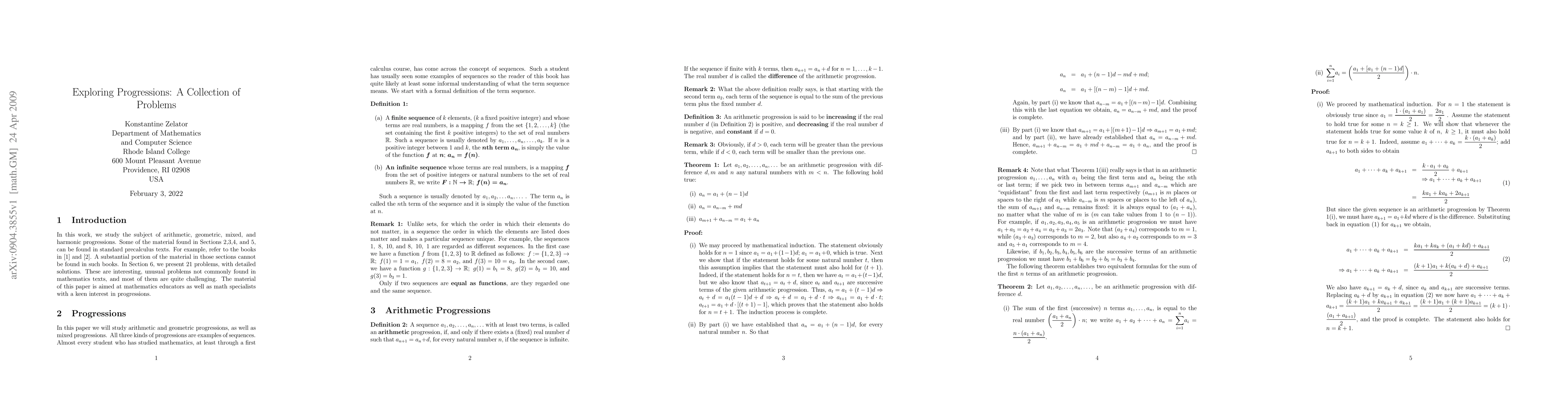 The material of this work is aimed at mathematics educators, as well as math specialists with a keen interest in progressions. In this paper, we study the subject of arithmetic, geometric, mixed, and harmonic progressions or sequences. Some of the material found in Sections 2,3,4,and 5, can also be found in standard precalculus texts. For example, refer to the books in references 1 and 2. A substantial portion of the material in those sections, cannot be found in such books. In Section 6, we present 21 problems with detailed solutions. These are interesting, unusual problems not commonly found in mathematics texts, and most of them are quite challenging. In Section 7, we offer a collection of unsolved problems.