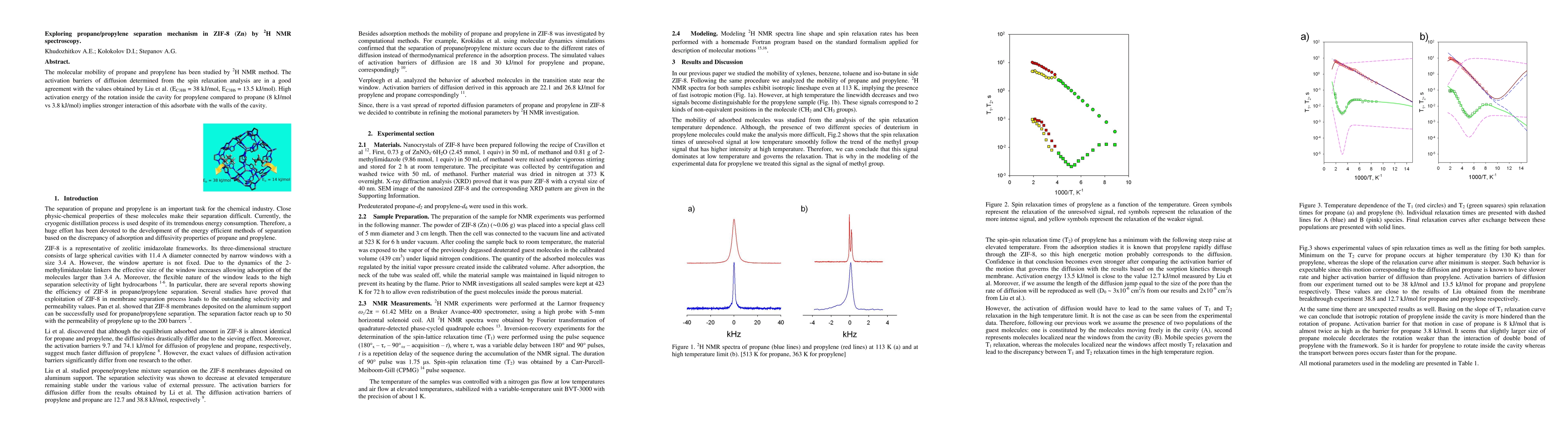 Summary: This study uses 2H NMR spectroscopy to investigate the diffusion and rotational dynamics of propane and propylene in ZIF-8. The activation barriers for diffusion align with previous findings, revealing stronger interactions of propylene with the ZIF-8 cavity walls due to higher rotational activation energy.