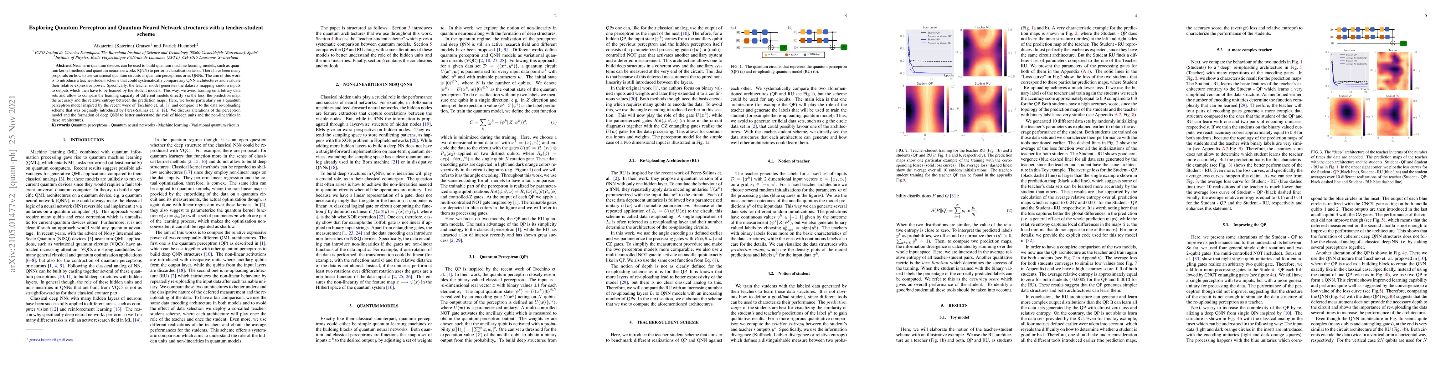 Near-term quantum devices can be used to build quantum machine learning models, such as quantum kernel methods and quantum neural networks (QNN) to perform classification tasks. There have been many proposals how to use variational quantum circuits as quantum perceptrons or as QNNs. The aim of this work is to systematically compare different QNN architectures and to evaluate their relative expressive power with a teacher-student scheme. Specifically, the teacher model generates the datasets mapping random inputs to outputs which then have to be learned by the student models. This way, we avoid training on arbitrary data sets and allow to compare the learning capacity of different models directly via the loss, the prediction map, the accuracy and the relative entropy between the prediction maps. We focus particularly on a quantum perceptron model inspired by the recent work of Tacchino et. al. \cite{Tacchino1} and compare it to the data re-uploading scheme that was originally introduced by P\'erez-Salinas et. al. \cite{data_re-uploading}. We discuss alterations of the perceptron model and the formation of deep QNN to better understand the role of hidden units and non-linearities in these architectures.