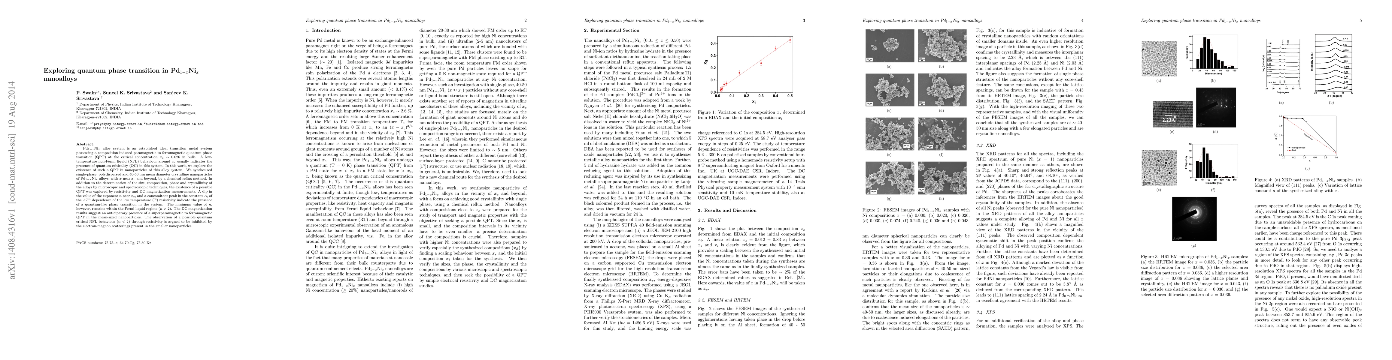 Pd$_{1-x}$Ni$_x$ alloy system is an established ideal transition metal system possessing a composition induced paramagnetic to ferromagnetic quantum phase transition (QPT) at the critical concentration $x_c \sim$ 0.026 in bulk. A low-temperature non-Fermi liquid (NFL) behaviour around $x_c$ usually indicates the presence of quantum criticality (QC) in this system. In this work, we explore the existence of such a QPT in nanoparticles of this alloy system. We synthesized single-phase, polydispersed and 40-50 nm mean diameter crystalline nanoparticles of Pd$_{1-x}$Ni$_x$ alloys, with $x$ near $x_c$ and beyond, by a chemical reflux method. In addition to the determination of the size, composition, phase and crystallinity of the alloys by microscopic and spectroscopic techniques, the existence of a possible QPT was explored by resistivity and DC magnetization measurements. A dip in the value of the exponent $n$ near $x_c$, and a concomitant peak in the constant $A$, of the $AT^n$ dependence of the low temperature ($T$) resistivity indicate the presence of a quantum-like phase transition in the system. The minimum value of $n$, however, remains within the Fermi liquid regime ($n >$ 2). The DC magnetization results suggest an anticipatory presence of a superparamagnetic to ferromagnetic QPT in the mean-sized nanoparticles. The observation of a possible quantum critical NFL behaviour ($n <$ 2) through resistivity is argued to be inhibited by the electron-magnon scatterings present in the smaller nanoparticles.