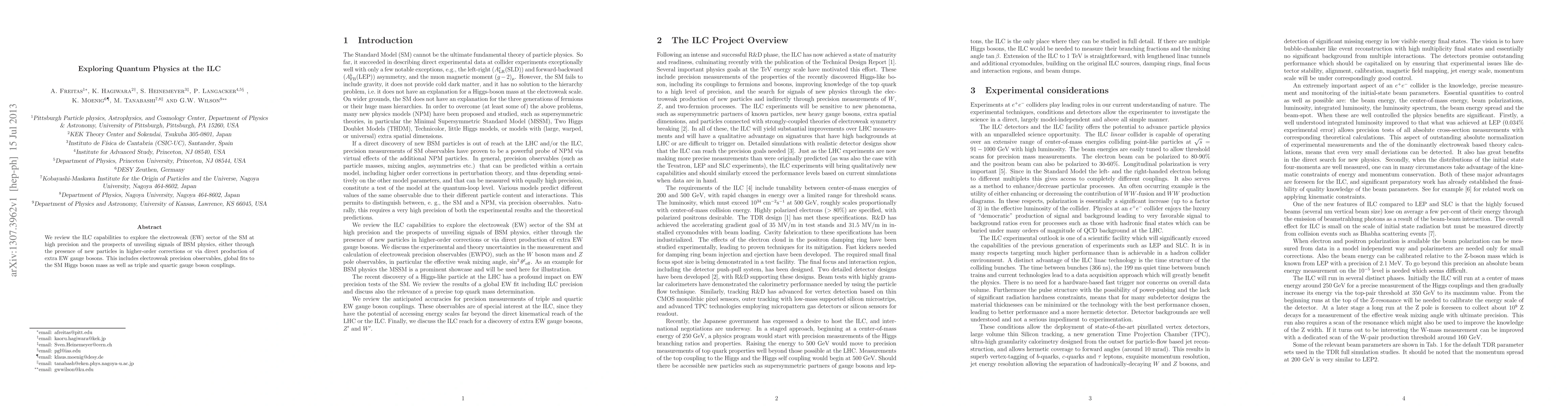 This paper reviews the International Linear Collider's (ILC) potential to precisely study the electroweak sector of the Standard Model and detect beyond-the-Standard-Model physics through new particles or extra gauge bosons, focusing on electroweak precision observables and Higgs boson mass fits.