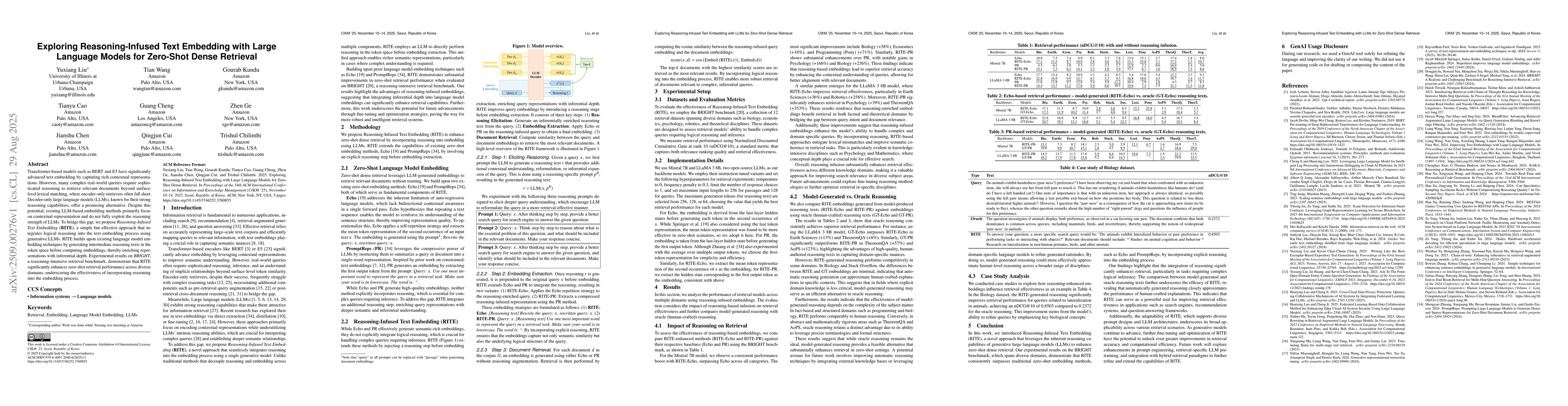 Transformer-based models such as BERT and E5 have significantly advanced text embedding by capturing rich contextual representations. However, many complex real-world queries require sophisticated reasoning to retrieve relevant documents beyond surface-level lexical matching, where encoder-only retrievers often fall short. Decoder-only large language models (LLMs), known for their strong reasoning capabilities, offer a promising alternative. Despite this potential, existing LLM-based embedding methods primarily focus on contextual representation and do not fully exploit the reasoning strength of LLMs. To bridge this gap, we propose Reasoning-Infused Text Embedding (RITE), a simple but effective approach that integrates logical reasoning into the text embedding process using generative LLMs. RITE builds upon existing language model embedding techniques by generating intermediate reasoning texts in the token space before computing embeddings, thereby enriching representations with inferential depth. Experimental results on BRIGHT, a reasoning-intensive retrieval benchmark, demonstrate that RITE significantly enhances zero-shot retrieval performance across diverse domains, underscoring the effectiveness of incorporating reasoning into the embedding process.