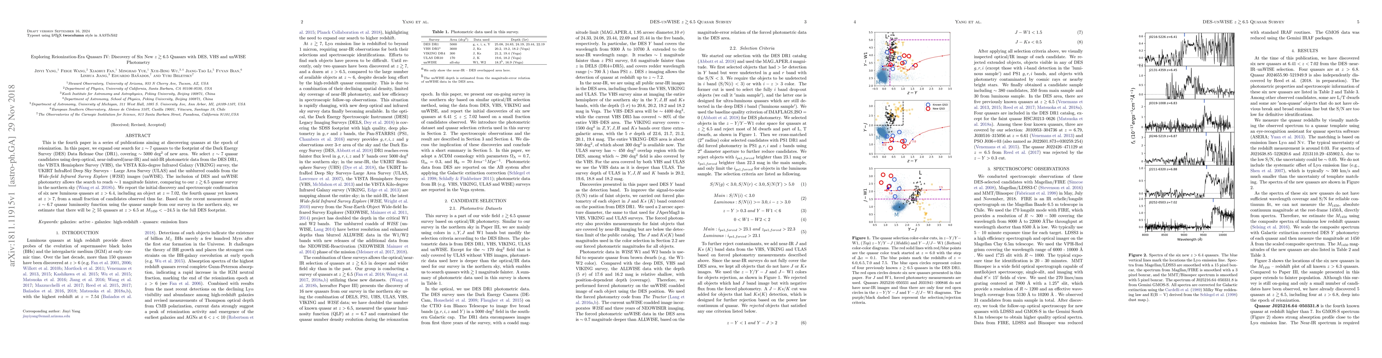 This paper reports the discovery of six new quasars at $z \gtrsim 6.5$, including one at $z=7.02$, using photometric data from DES, VHS, VIKING, ULAS, and unWISE. The study estimates the presence of over 55 quasars at $z > 6.5$ in the full Dark Energy Survey area.