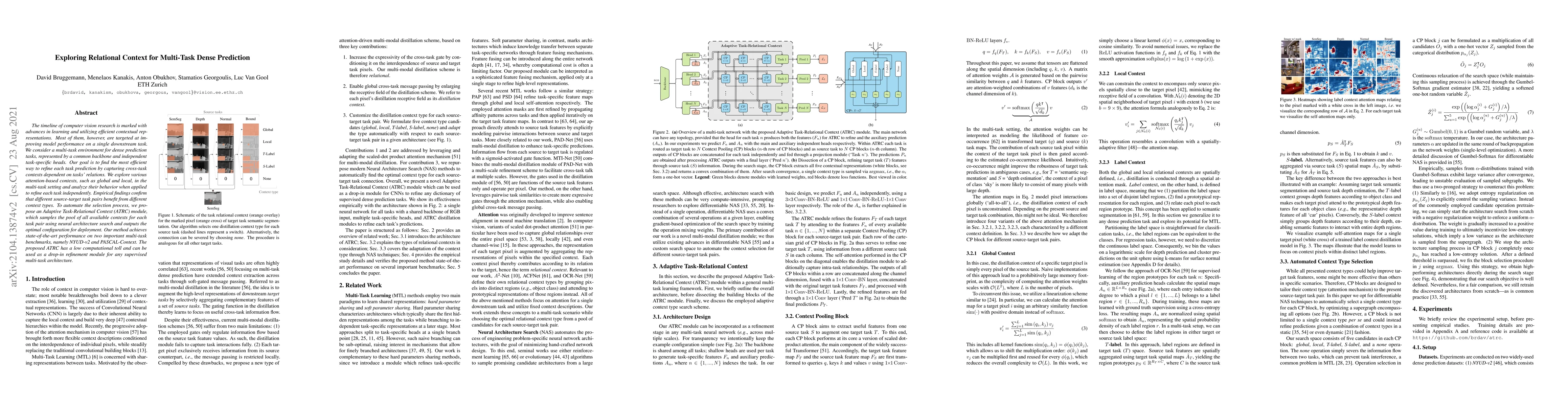 The research explores relational context for multi-task dense prediction using attention-based mechanisms, proposing an Adaptive Task-Relational Context (ATRC) module for automated context type selection via neural architecture search.