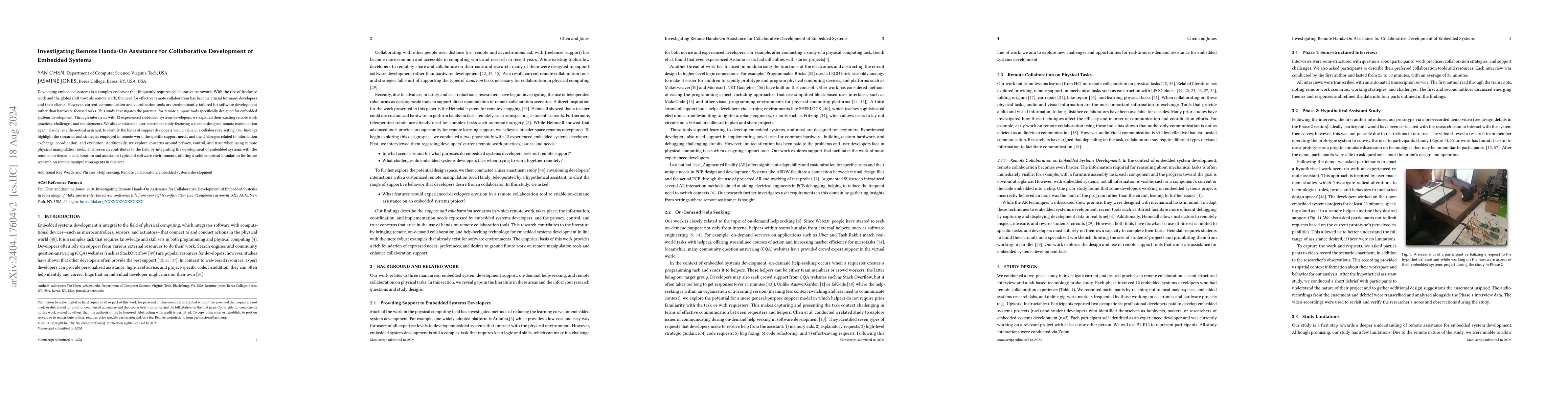 This research explores remote support tools for embedded systems development, interviewing 12 experienced developers to identify challenges and needs in remote collaboration. Findings reveal scenarios, support needs, and privacy concerns regarding remote physical manipulation, contributing to the design of future remote collaboration tools in embedded systems.