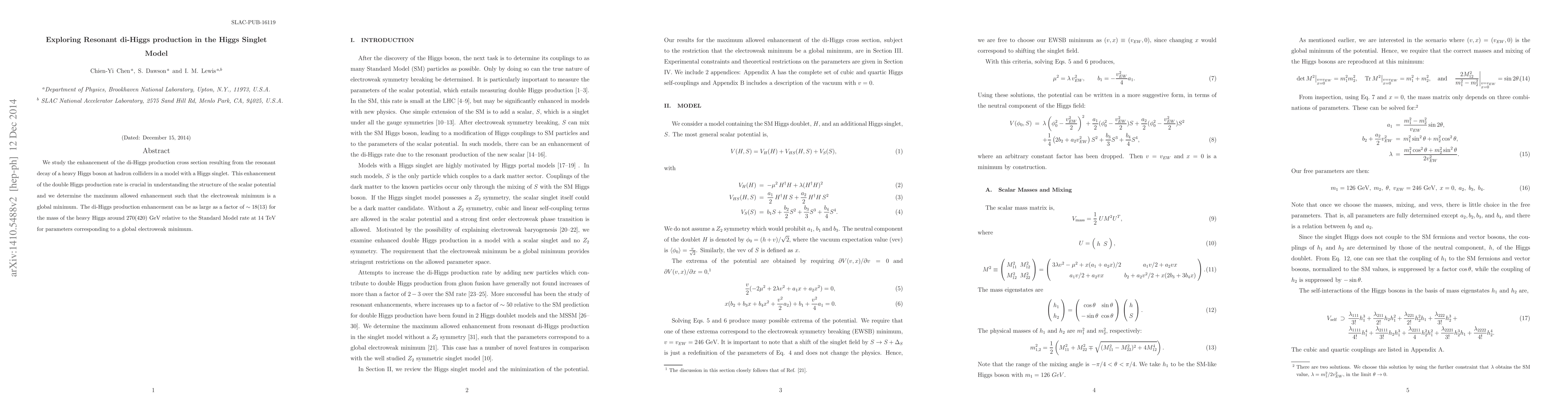 This paper investigates the resonant di-Higgs production in a Higgs Singlet Model, finding significant enhancements in the production rate due to a heavy Higgs boson decay. The maximum enhancement observed is approximately a factor of 18 (13) for heavy Higgs masses around 270 (420) GeV, relative to the Standard Model rate at 14 TeV, ensuring the electroweak minimum remains globally stable.
