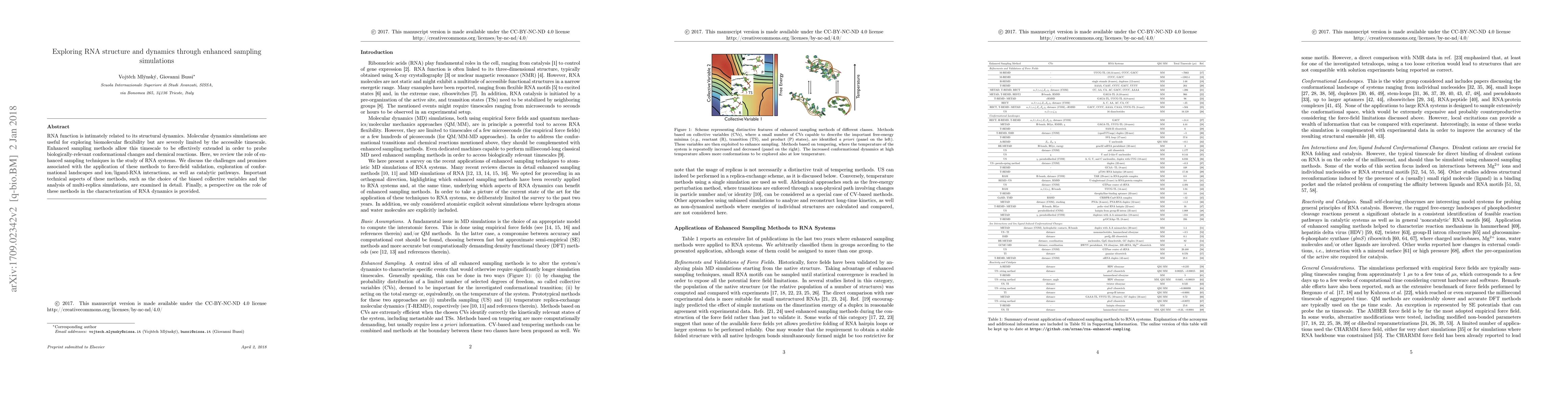 This paper reviews enhanced sampling techniques for probing RNA structural dynamics, highlighting their application in force-field validation, conformational landscape exploration, and ion/ligand interactions. It discusses technical aspects and provides a perspective on the future role of these methods in RNA dynamics characterization.