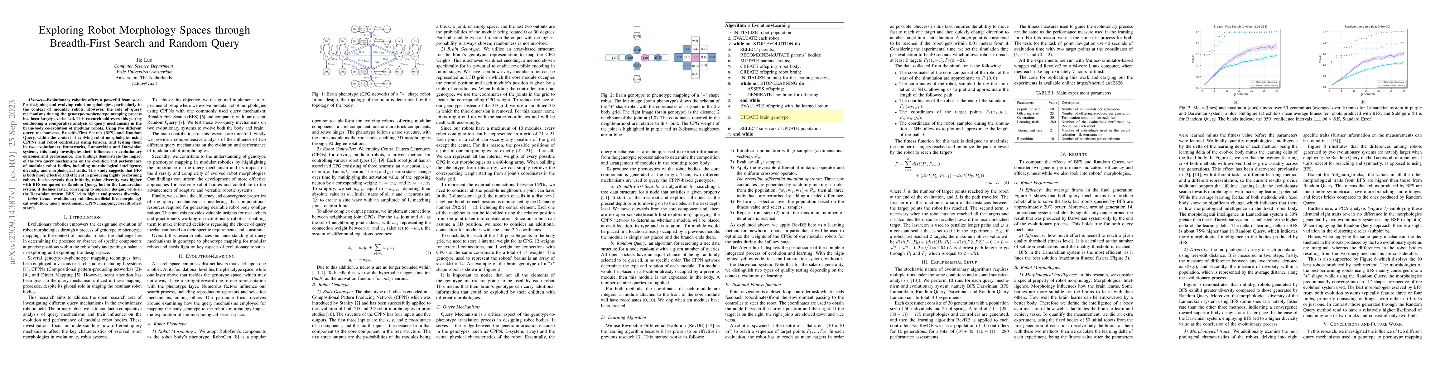 This paper investigates the impact of Breadth-First Search (BFS) and Random Query mechanisms on the evolution of modular robot morphologies using CPPNs and tensor controllers. It finds that BFS is more effective and efficient in producing high-performing robots, with higher initial diversity but faster convergence in Lamarckian systems, and higher end-process diversity in Darwinian systems.