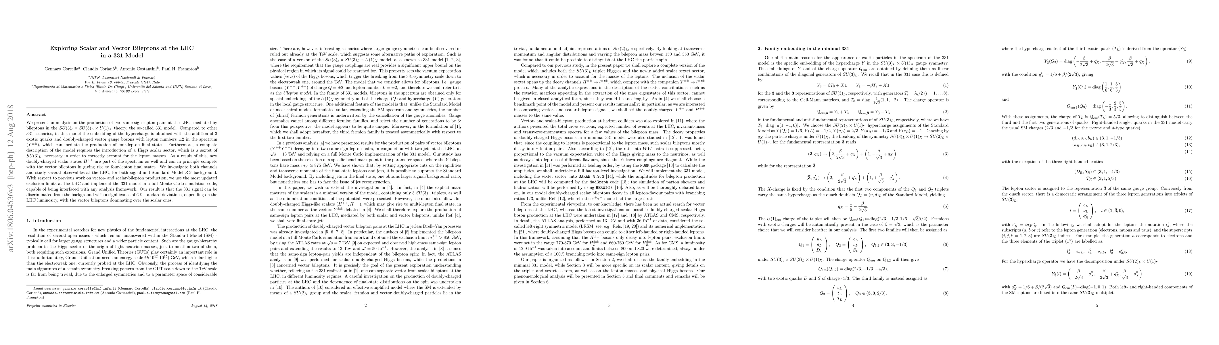 We present an analysis on the production of two same-sign lepton pairs at the LHC, mediated by bileptons in the $SU(3)_c\times SU(3)_L\times U(1)_X$ theory, the so-called 331 model. Compared to other 331 scenarios, in this model the embedding of the hypercharge is obtained with the addition of 3 exotic quarks and doubly-charged vector gauge bosons with lepton numbers $\pm 2$ in the spectrum ($Y^{\pm\pm}$), which can mediate the production of four-lepton final states. Furthermore, a complete description of the model requires the introduction of a Higgs scalar sector, which is a sextet of $SU(3)_L$, necessary in order to correctly account for the lepton masses. As a result of this, new doubly-charged scalar states $H^{\pm\pm}$ are part of the spectrum as well and can in principle compete with the vector bileptons in giving rise to four-lepton final states. We investigate both channels and study several observables at the LHC, for both signal and Standard Model $ZZ$ background. With respect to previous work on vector- and scalar-bilepton production, we use the most updated exclusion limits at the LHC and implement the 331 model in a full Monte Carlo simulation code, capable of being interfaced with any analysis framework. Our result is that the 331 signal can be discriminated from the background with a significance of 6-9 standard deviations, depending on the LHC luminosity, with the vector bileptons dominating over the scalar ones.