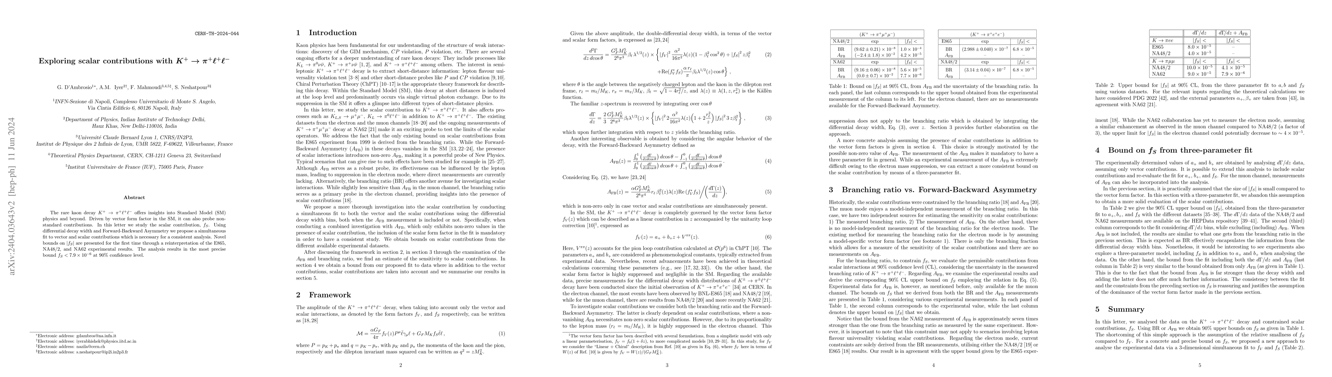 The rare kaon decay $K^+ \to \pi^+\ell^+\ell^-$ offers insights into Standard Model (SM) physics and beyond. Driven by vector form factor in the SM, it can also probe non-standard contributions. In this letter we study the scalar contribution, $f_S$. Using differential decay width and Forward-Backward Asymmetry we propose a simultaneous fit to vector and scalar contributions which is necessary for a consistent analysis. Novel bounds on $|f_S|$ are presented for the first time through a reinterpretation of the E865, NA48/2, and NA62 experimental results. The analysis results in the most precise bound $f_S < 7.9\times 10^{-6}$ at 90$\%$ confidence level.