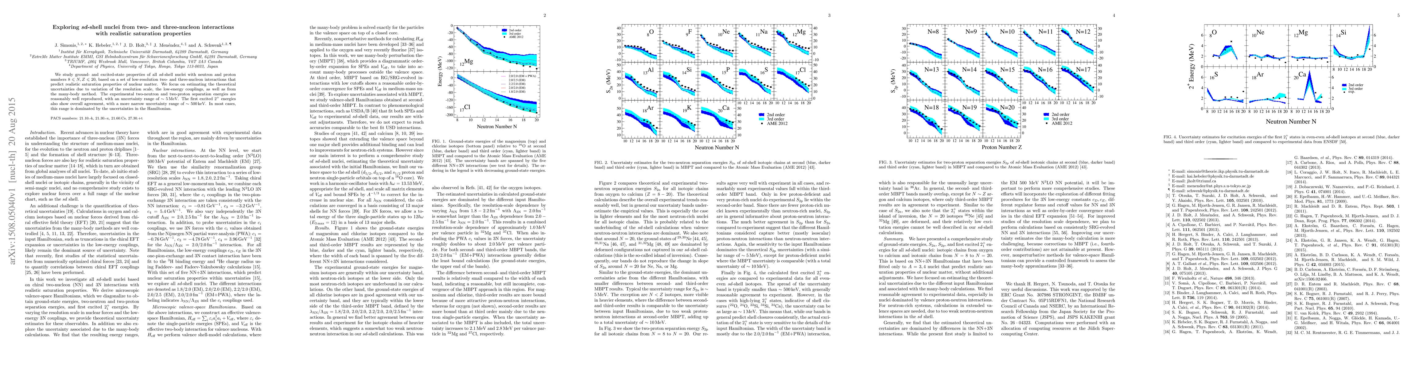 We study ground- and excited-state properties of all sd-shell nuclei with neutron and proton numbers 8 <= N,Z <= 20, based on a set of low-resolution two- and three-nucleon interactions that predict realistic saturation properties of nuclear matter. We focus on estimating the theoretical uncertainties due to variation of the resolution scale, the low-energy couplings, as well as from the many-body method. The experimental two-neutron and two-proton separation energies are reasonably well reproduced, with an uncertainty range of about 5 MeV. The first excited 2+ energies also show overall agreement, with a more narrow uncertainty range of about 500 keV. In most cases, this range is dominated by the uncertainties in the Hamiltonian.