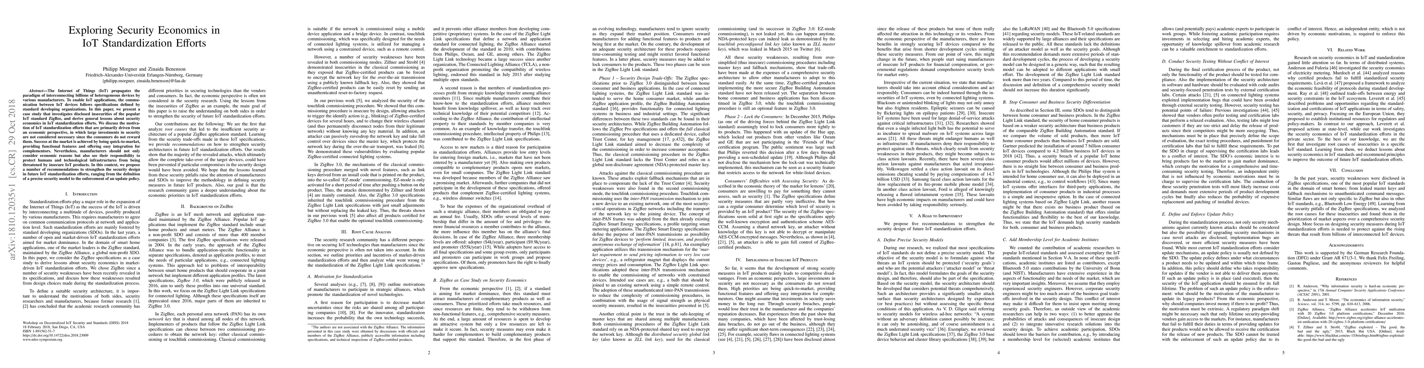 This paper examines the economic motivations behind IoT standardization, highlighting the security flaws in the ZigBee standard and advocating for a balanced approach that considers both economic and security imperatives. It proposes recommendations to enhance security in future IoT standards, emphasizing the need for responsible design to protect users and infrastructure.