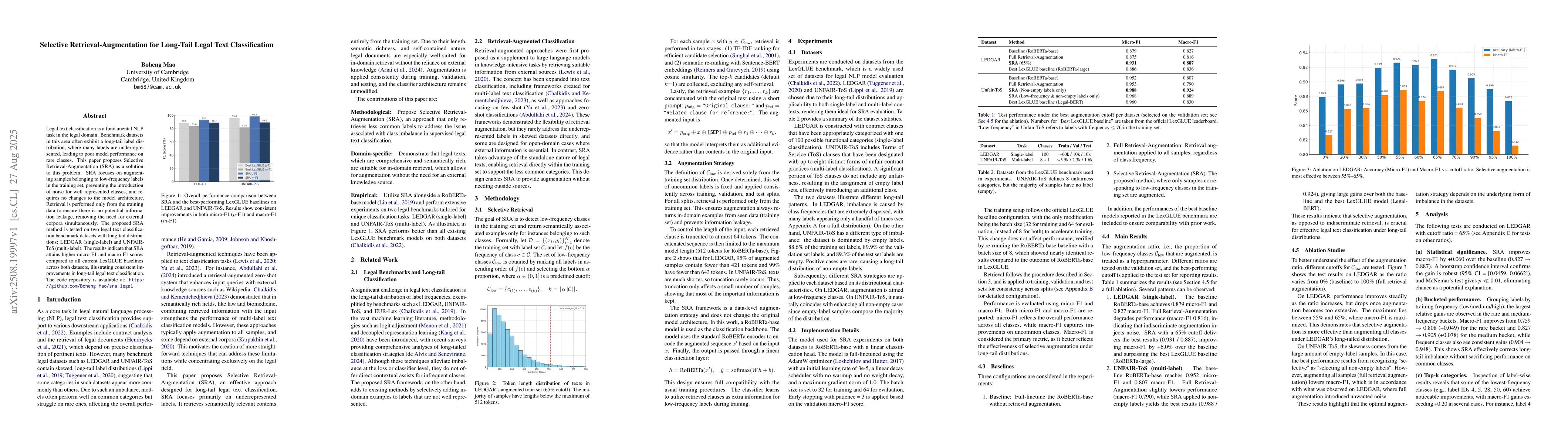 Legal text classification is a fundamental NLP task in the legal domain. Benchmark datasets in this area often exhibit a long-tail label distribution, where many labels are underrepresented, leading to poor model performance on rare classes. This paper explores Selective Retrieval-Augmentation (SRA) as a proof-of-concept approach to this problem. SRA focuses on augmenting samples belonging to low-frequency labels in the training set, preventing the introduction of noise for well-represented classes, and requires no changes to the model architecture. Retrieval is performed only from the training data to ensure there is no potential information leakage, removing the need for external corpora simultaneously. SRA is tested on two legal text classification benchmark datasets with long-tail distributions: LEDGAR (single-label) and UNFAIR-ToS (multi-label). Results show that SRA achieves consistent gains in both micro-F1 and macro-F1 over LexGLUE baselines.