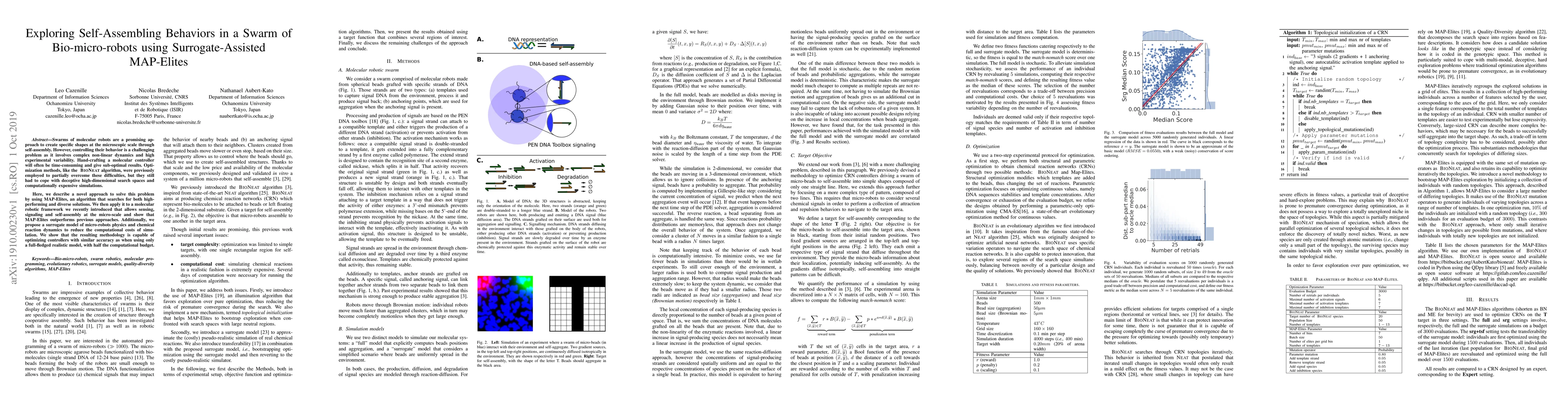 This paper explores optimizing self-assembling behaviors in a swarm of bio-micro-robots using MAP-Elites and surrogate models, demonstrating that it outperforms previous methods while reducing computational costs by half. The proposed approach effectively handles the complex dynamics and high variability inherent in molecular robotics.