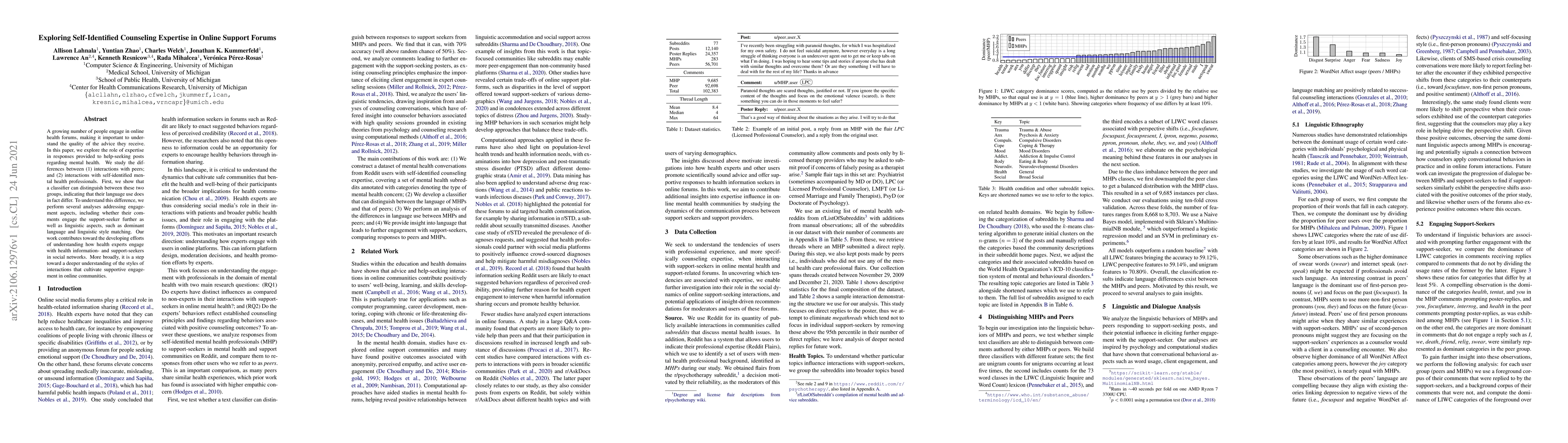 This paper investigates the differences in responses from peers and self-identified mental health professionals in online health forums, using a classifier to distinguish their language use. The study finds that these groups engage differently, with implications for understanding supportive interactions in online communities.