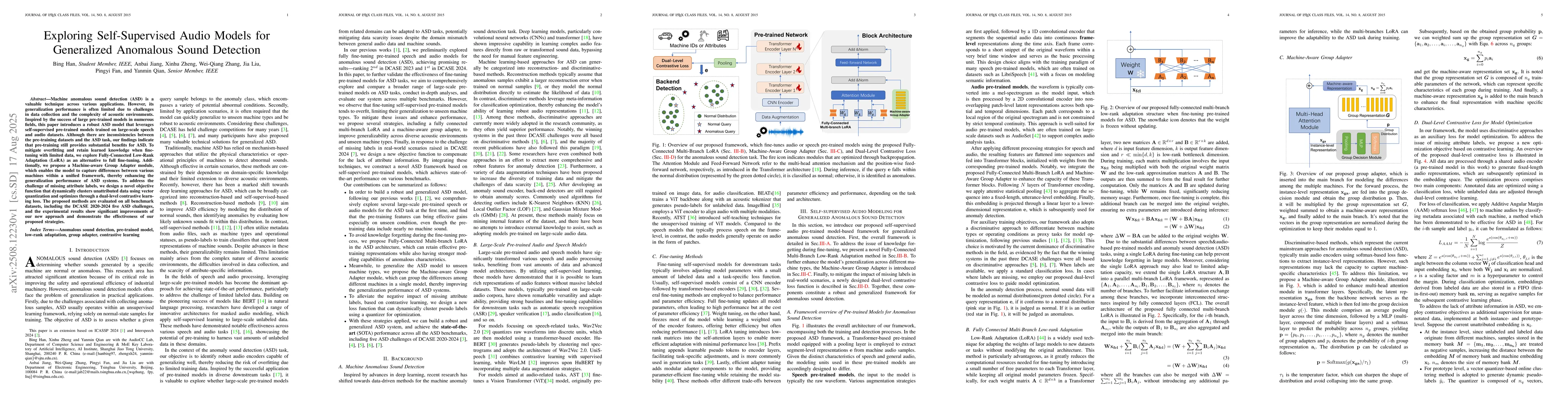 Machine anomalous sound detection (ASD) is a valuable technique across various applications. However, its generalization performance is often limited due to challenges in data collection and the complexity of acoustic environments. Inspired by the success of large pre-trained models in numerous fields, this paper introduces a robust ASD model that leverages self-supervised pre-trained models trained on large-scale speech and audio datasets. Although there are inconsistencies between the pre-training datasets and the ASD task, our findings indicate that pre-training still provides substantial benefits for ASD. To mitigate overfitting and retain learned knowledge when fine-tuning with limited data, we explore Fully-Connected Low-Rank Adaptation (LoRA) as an alternative to full fine-tuning. Additionally, we propose a Machine-aware Group Adapter module, which enables the model to capture differences between various machines within a unified framework, thereby enhancing the generalization performance of ASD systems. To address the challenge of missing attribute labels, we design a novel objective function that dynamically clusters unattributed data using vector quantization and optimizes through a dual-level contrastive learning loss. The proposed methods are evaluated on all benchmark datasets, including the DCASE 2020-2024 five ASD challenges, and the experimental results show significant improvements of our new approach and demonstrate the effectiveness of our proposed strategies.