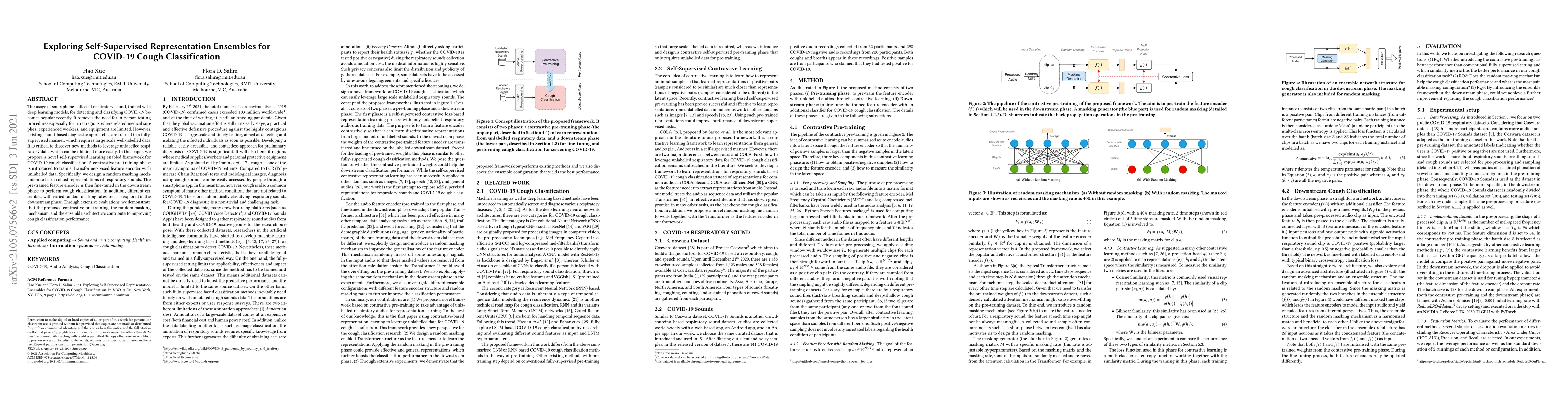 This paper proposes a self-supervised learning framework for COVID-19 cough classification using smartphone-collected respiratory sounds. It employs a Transformer-based encoder trained with contrastive pre-training and random masking on unlabelled data, followed by ensemble methods to enhance classification performance.