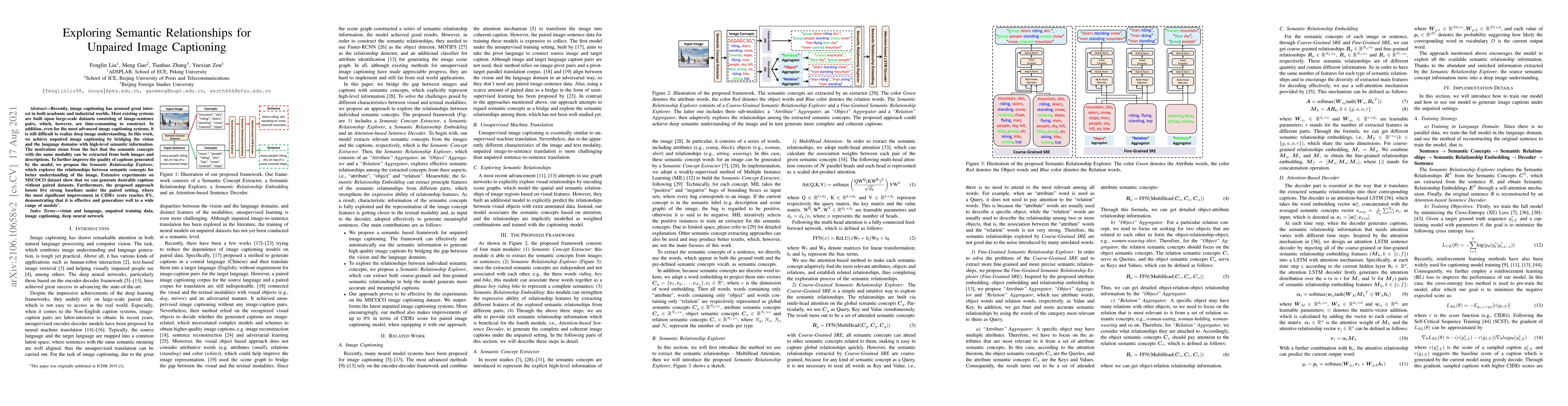 This paper proposes an unpaired image captioning method that leverages high-level semantic information to bridge vision and language domains, introducing the Semantic Relationship Explorer to enhance caption quality. Experiments on MSCOCO show significant improvements, achieving better captions without paired datasets and boosting baselines by up to 8% in CIDEr score.