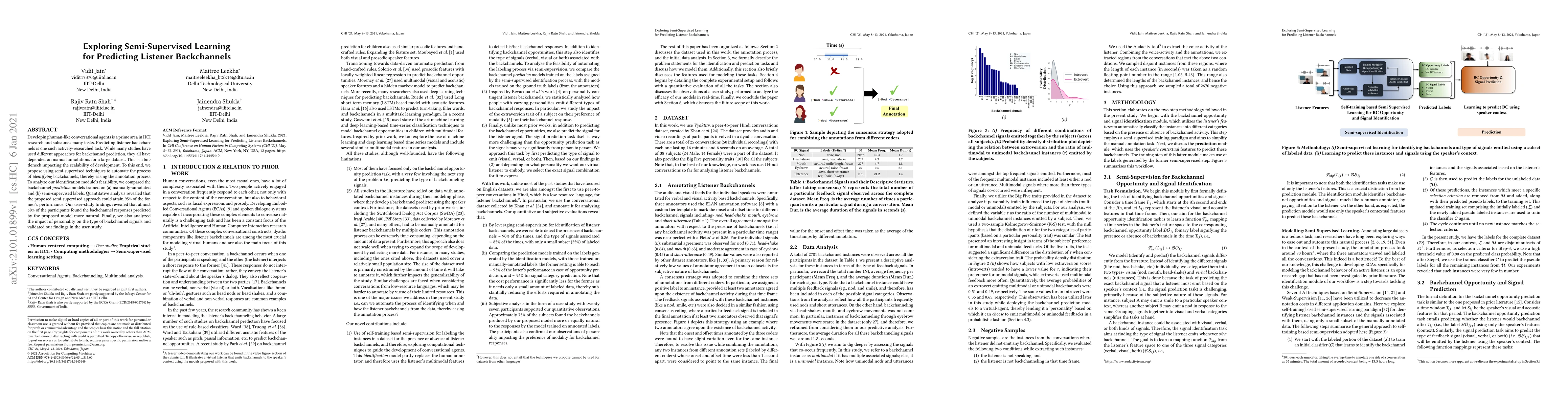 Developing human-like conversational agents is a prime area in HCI research and subsumes many tasks. Predicting listener backchannels is one such actively-researched task. While many studies have used different approaches for backchannel prediction, they all have depended on manual annotations for a large dataset. This is a bottleneck impacting the scalability of development. To this end, we propose using semi-supervised techniques to automate the process of identifying backchannels, thereby easing the annotation process. To analyze our identification module's feasibility, we compared the backchannel prediction models trained on (a) manually-annotated and (b) semi-supervised labels. Quantitative analysis revealed that the proposed semi-supervised approach could attain 95% of the former's performance. Our user-study findings revealed that almost 60% of the participants found the backchannel responses predicted by the proposed model more natural. Finally, we also analyzed the impact of personality on the type of backchannel signals and validated our findings in the user-study.